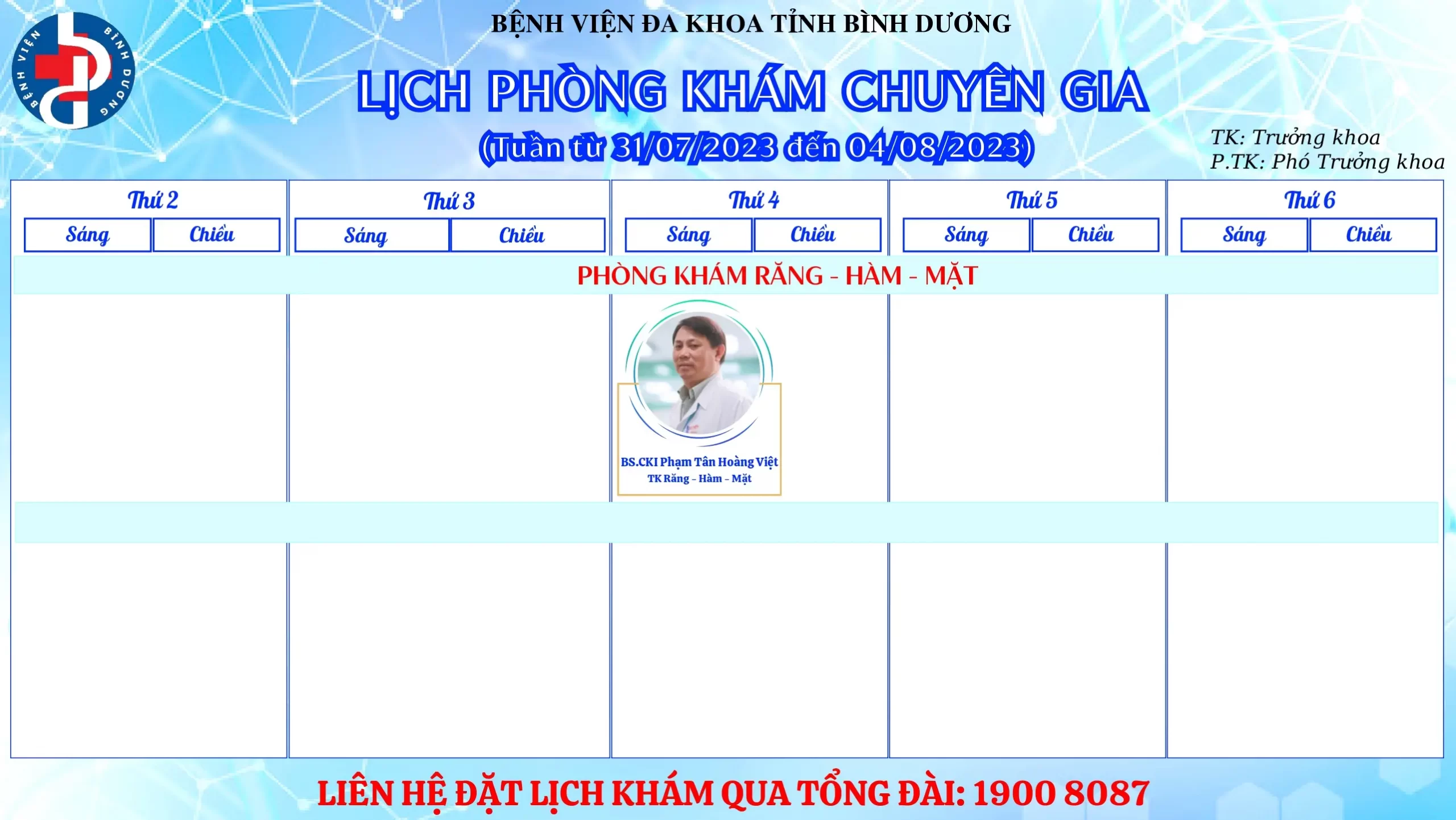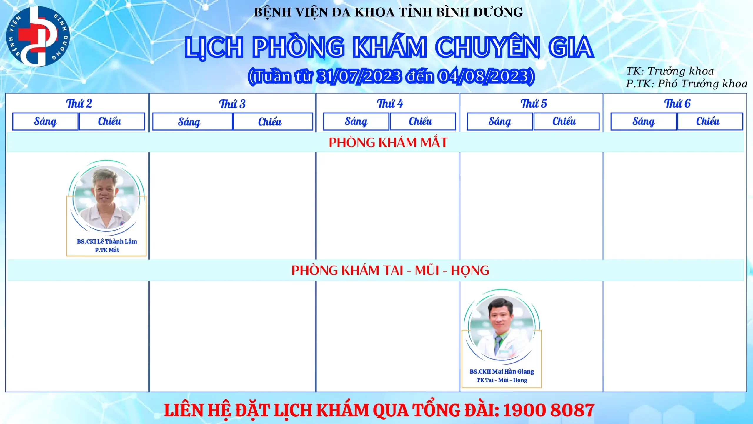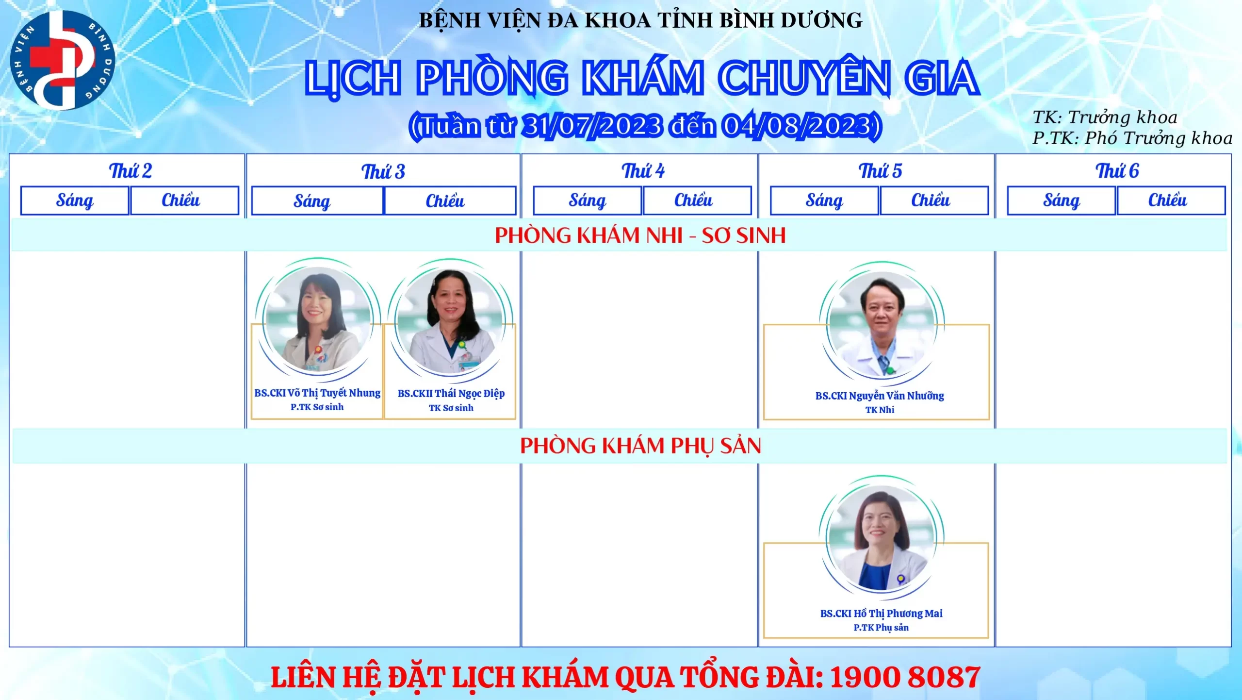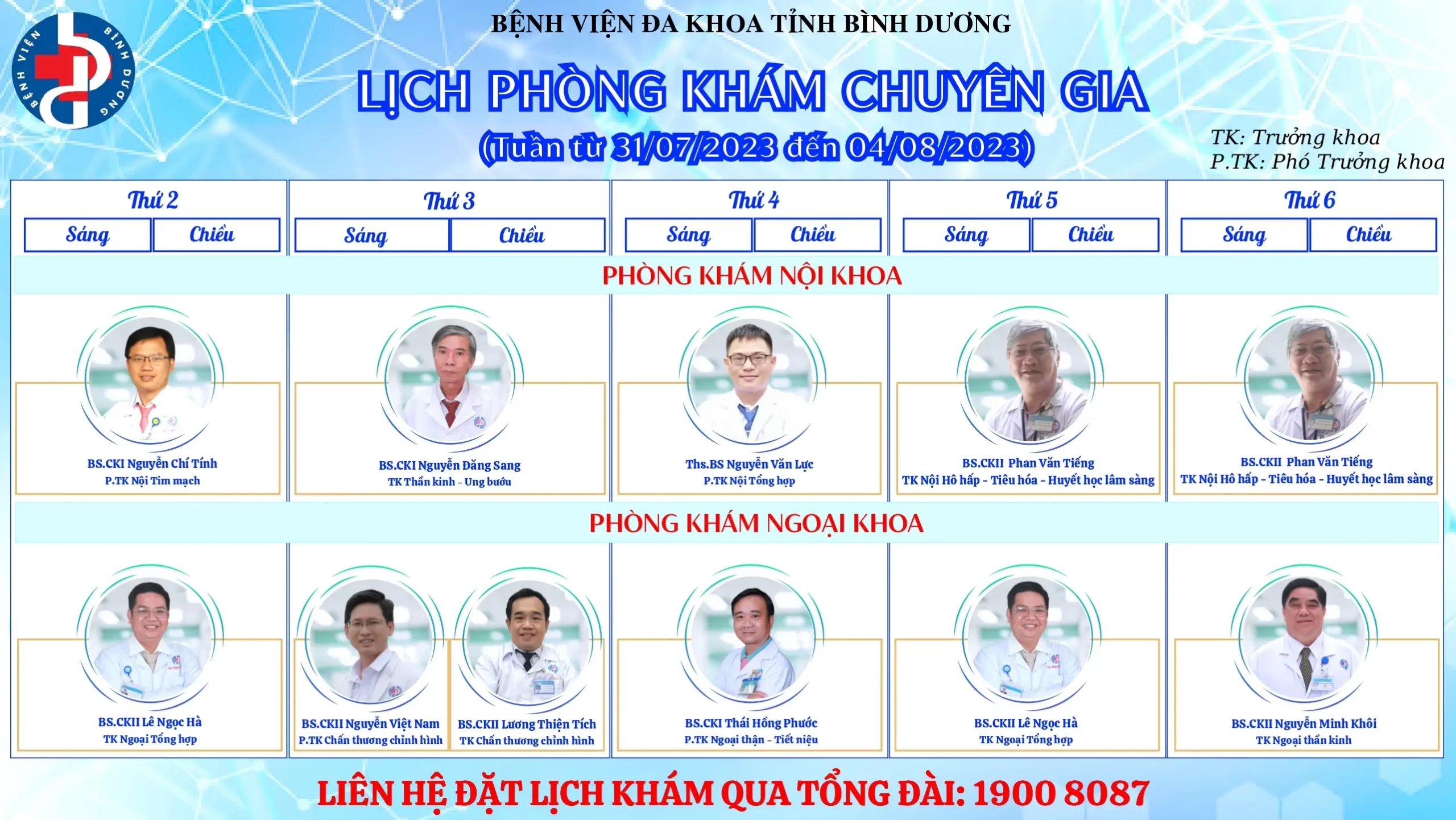 🌟🌟🌟LỊCH PHÒNG KHÁM CHUYÊN GIA BỆNH VIỆN ĐA KHOA TỈNH BÌNH DƯƠNG.