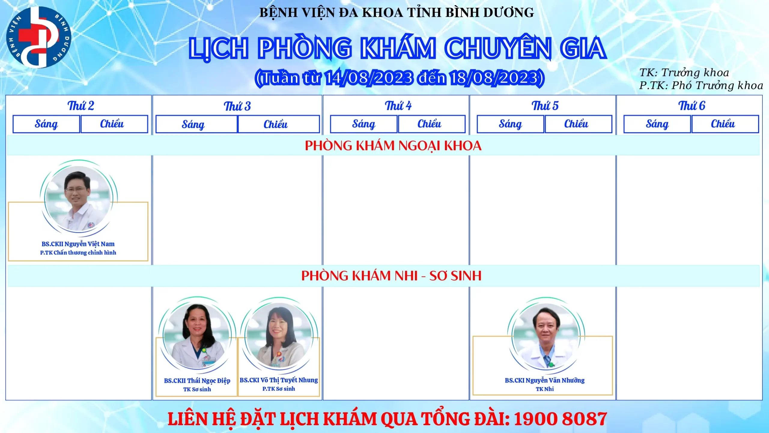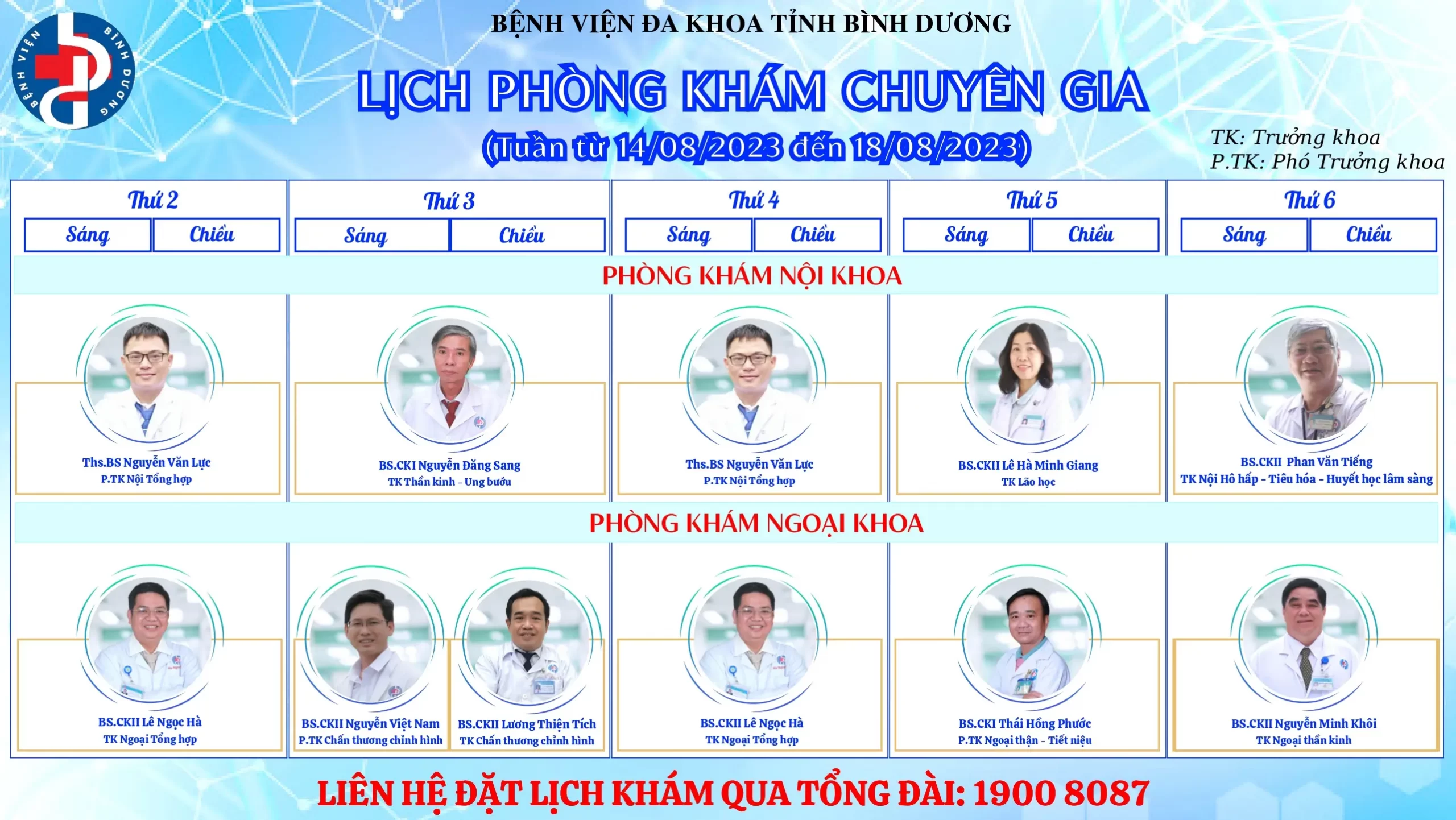 🌟🌟🌟LỊCH PHÒNG KHÁM CHUYÊN GIA BỆNH VIỆN ĐA KHOA TỈNH BÌNH DƯƠNG.