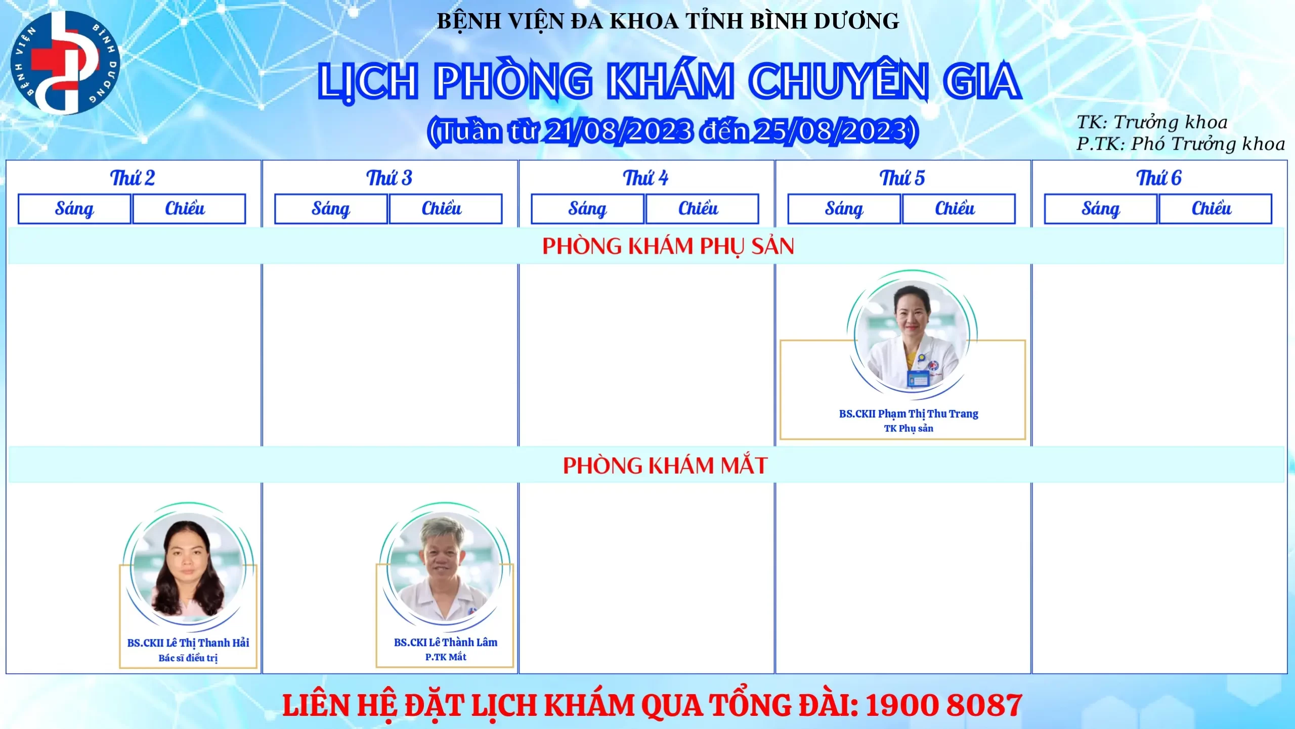 🌟🌟🌟LỊCH PHÒNG KHÁM CHUYÊN GIA BỆNH VIỆN ĐA KHOA TỈNH BÌNH DƯƠNG.