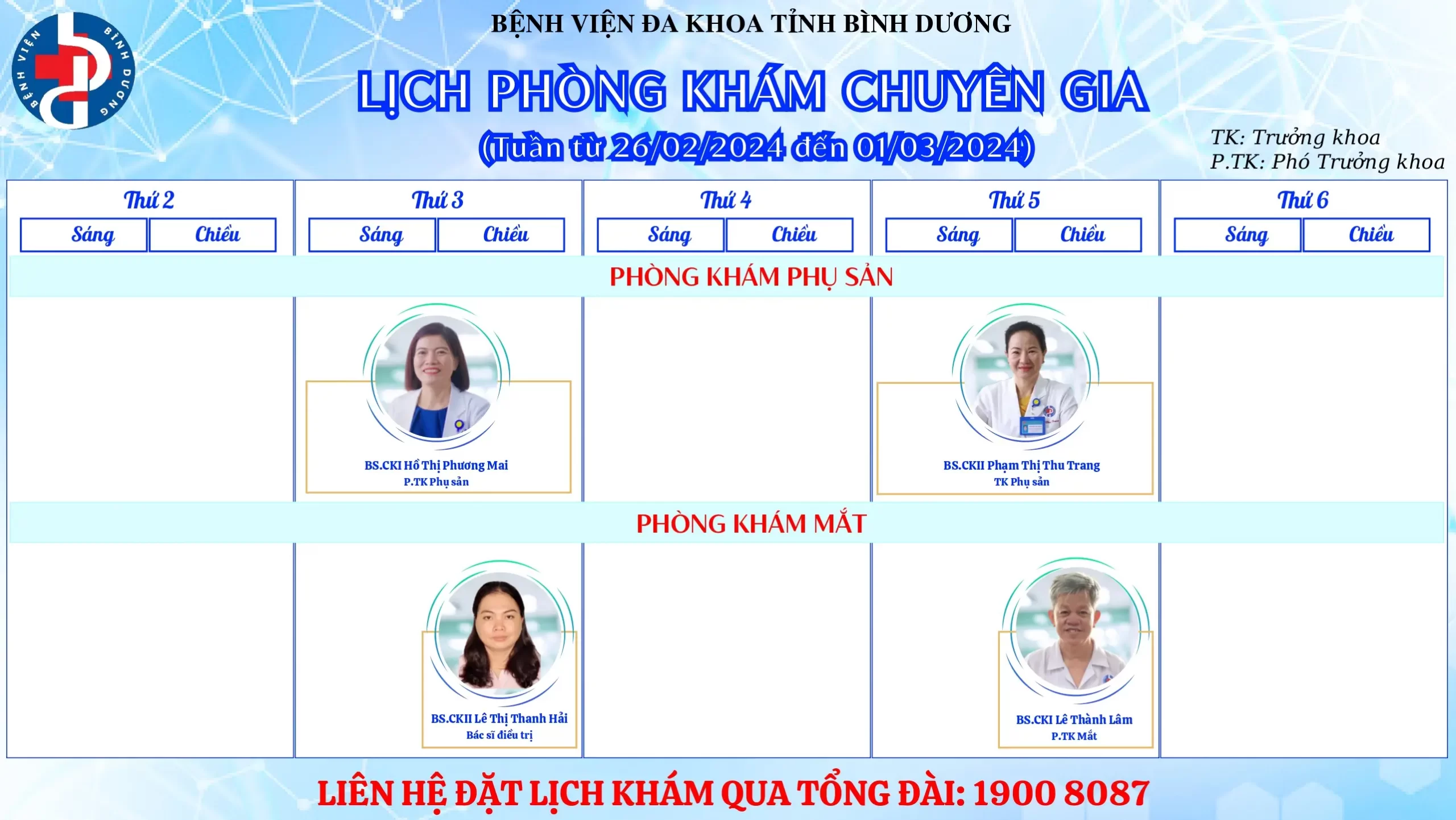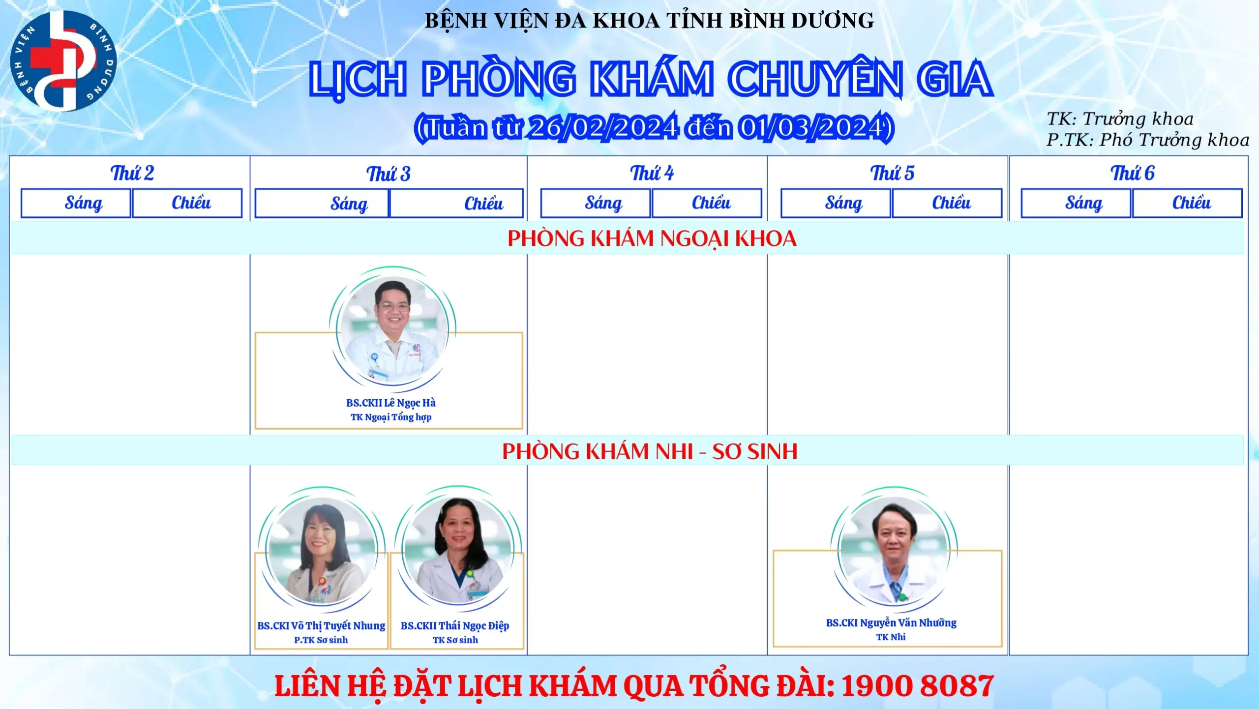 🌟🌟🌟LỊCH PHÒNG KHÁM CHUYÊN GIA BỆNH VIỆN ĐA KHOA TỈNH BÌNH DƯƠNG.