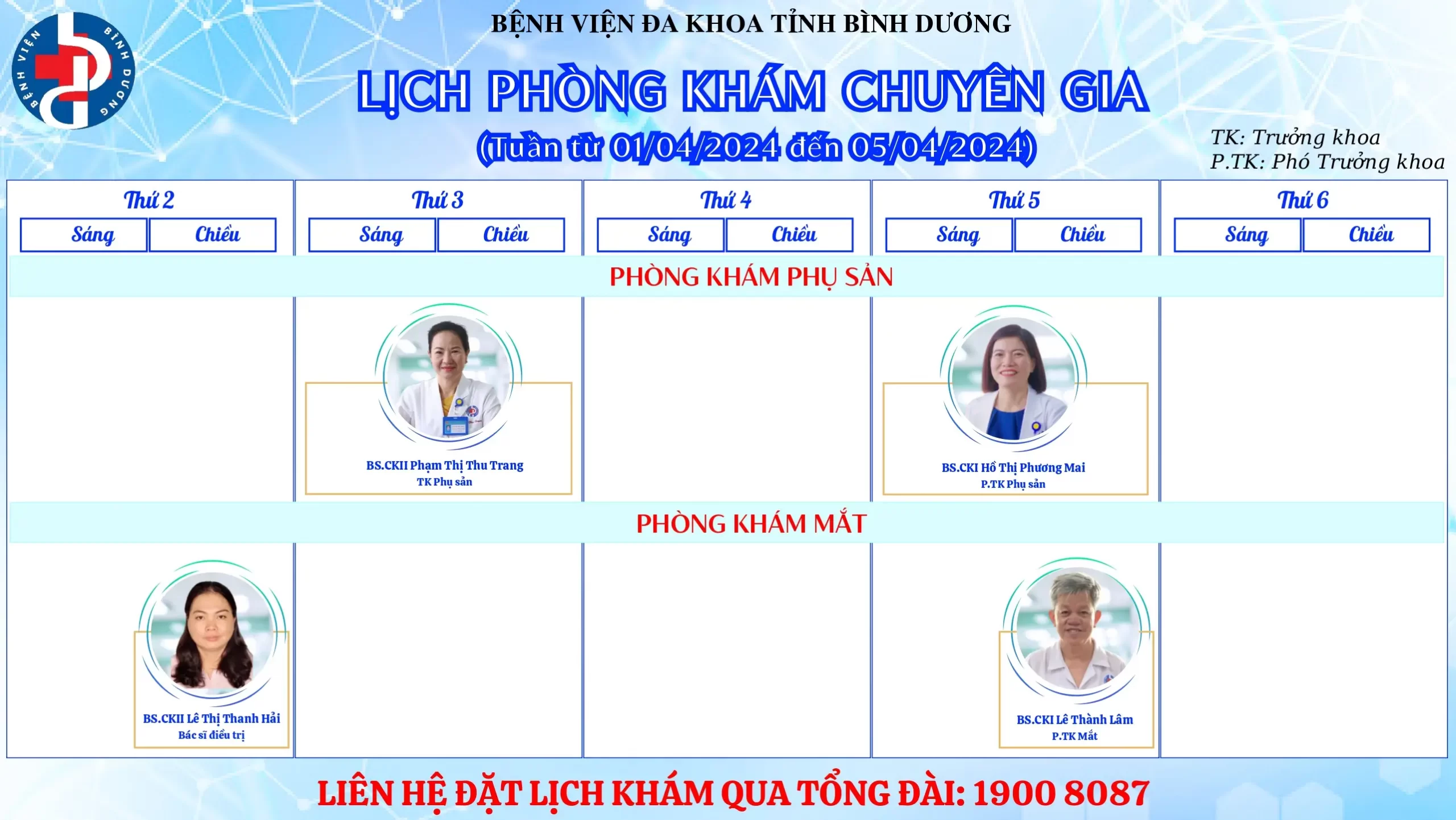 🌟🌟🌟LỊCH PHÒNG KHÁM CHUYÊN GIA BỆNH VIỆN ĐA KHOA TỈNH BÌNH DƯƠNG.