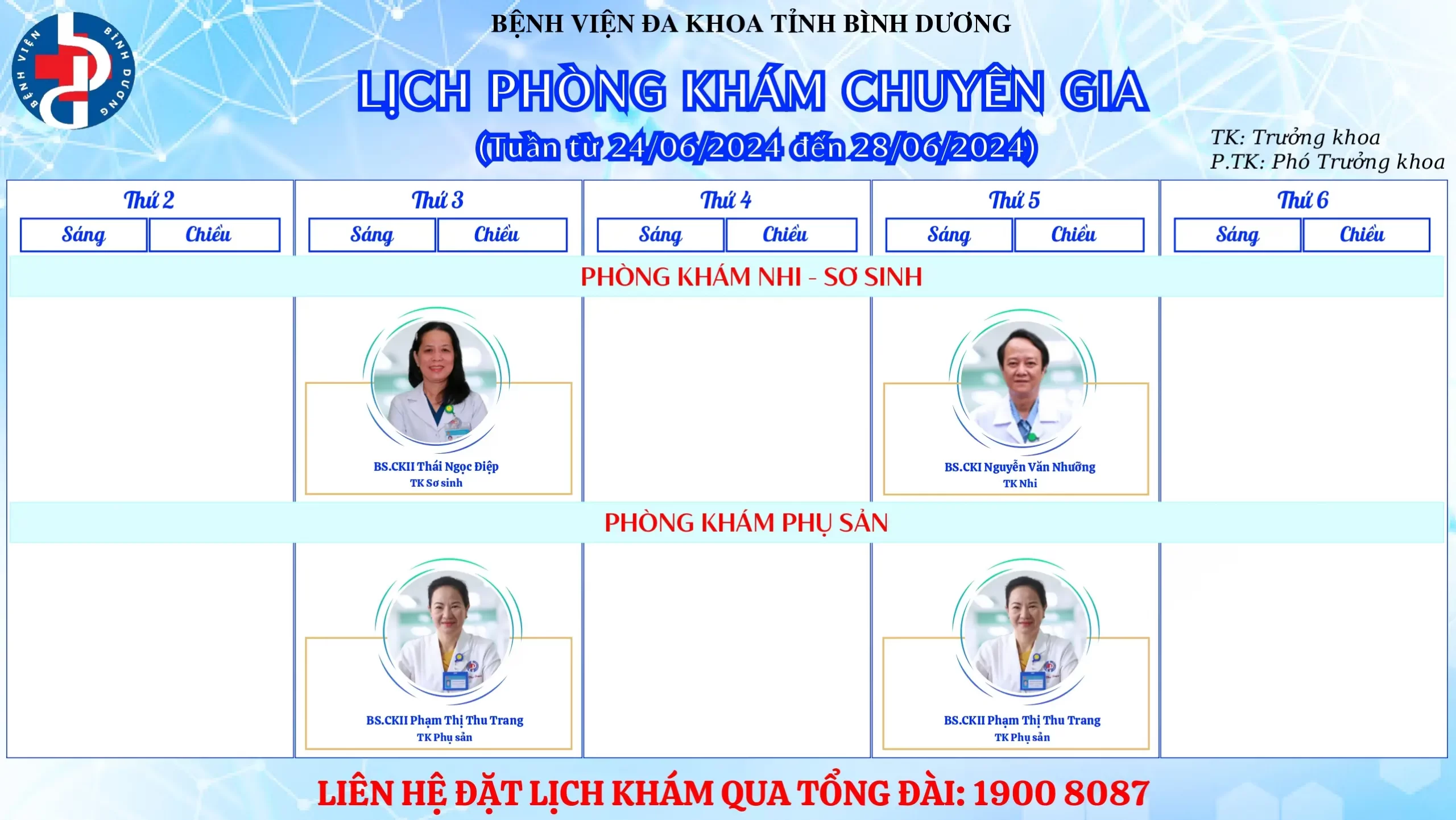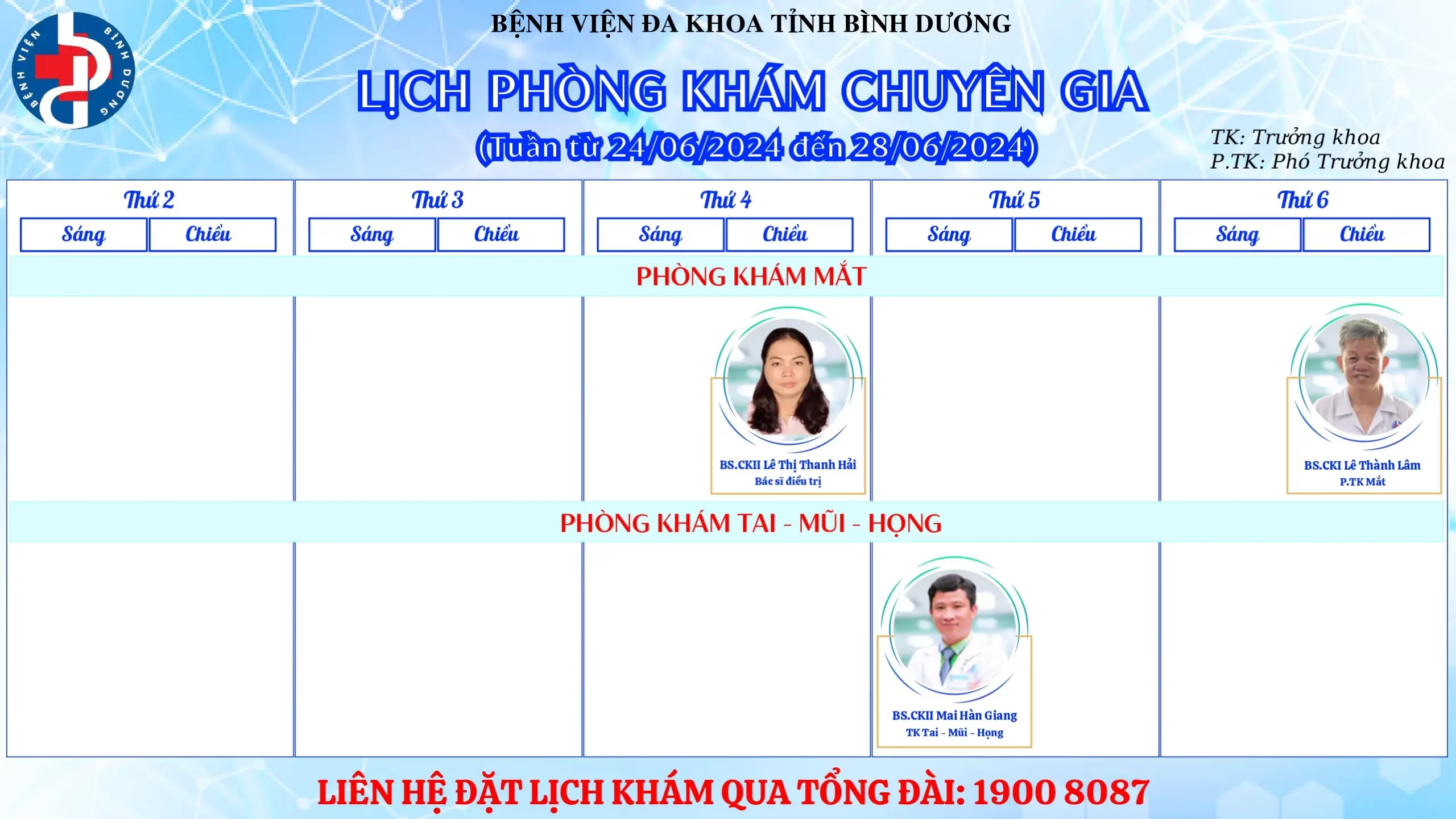 🌟🌟🌟LỊCH PHÒNG KHÁM CHUYÊN GIA BỆNH VIỆN ĐA KHOA TỈNH BÌNH DƯƠNG.