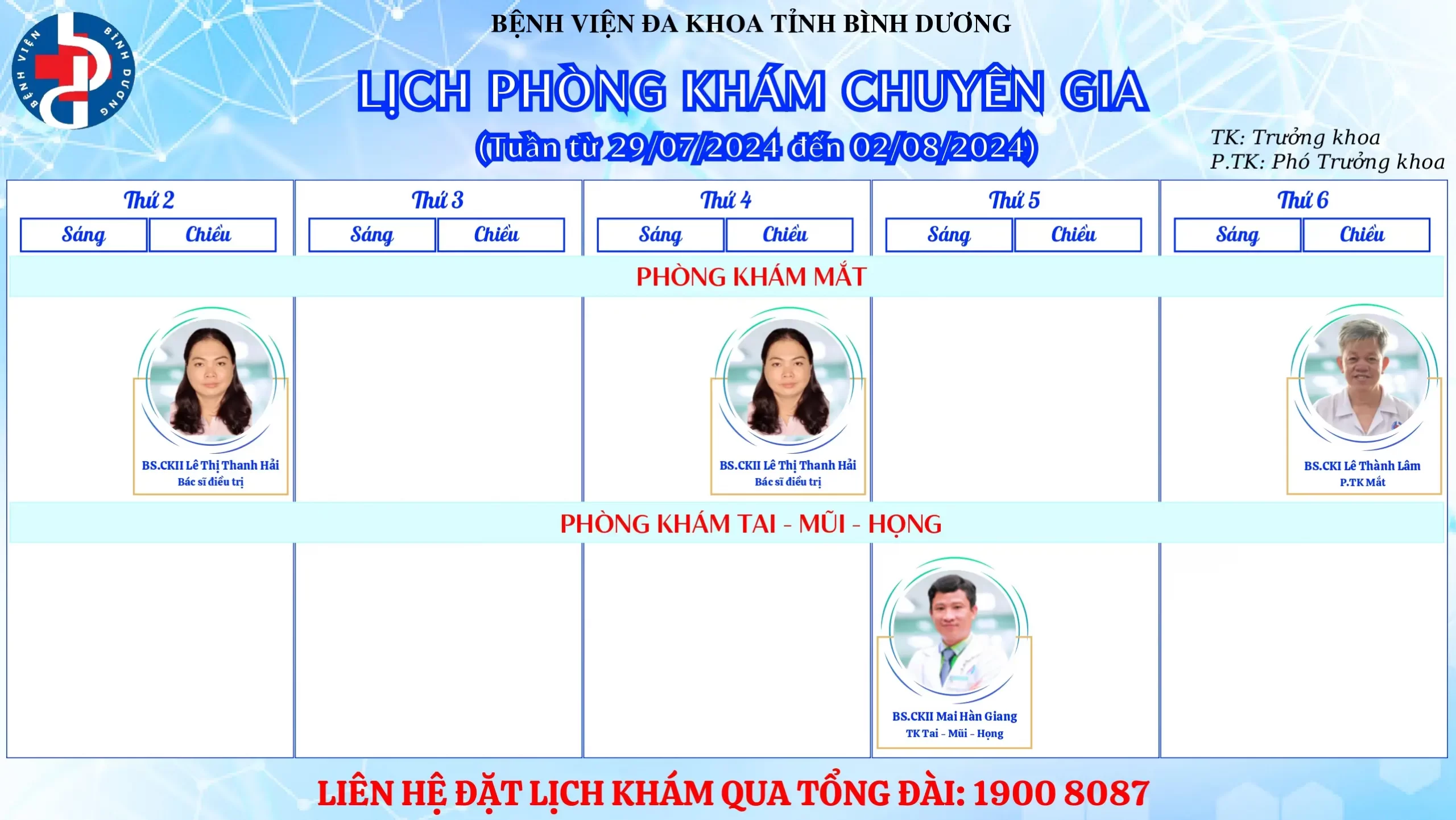 🌟🌟🌟LỊCH PHÒNG KHÁM CHUYÊN GIA BỆNH VIỆN ĐA KHOA TỈNH BÌNH DƯƠNG.