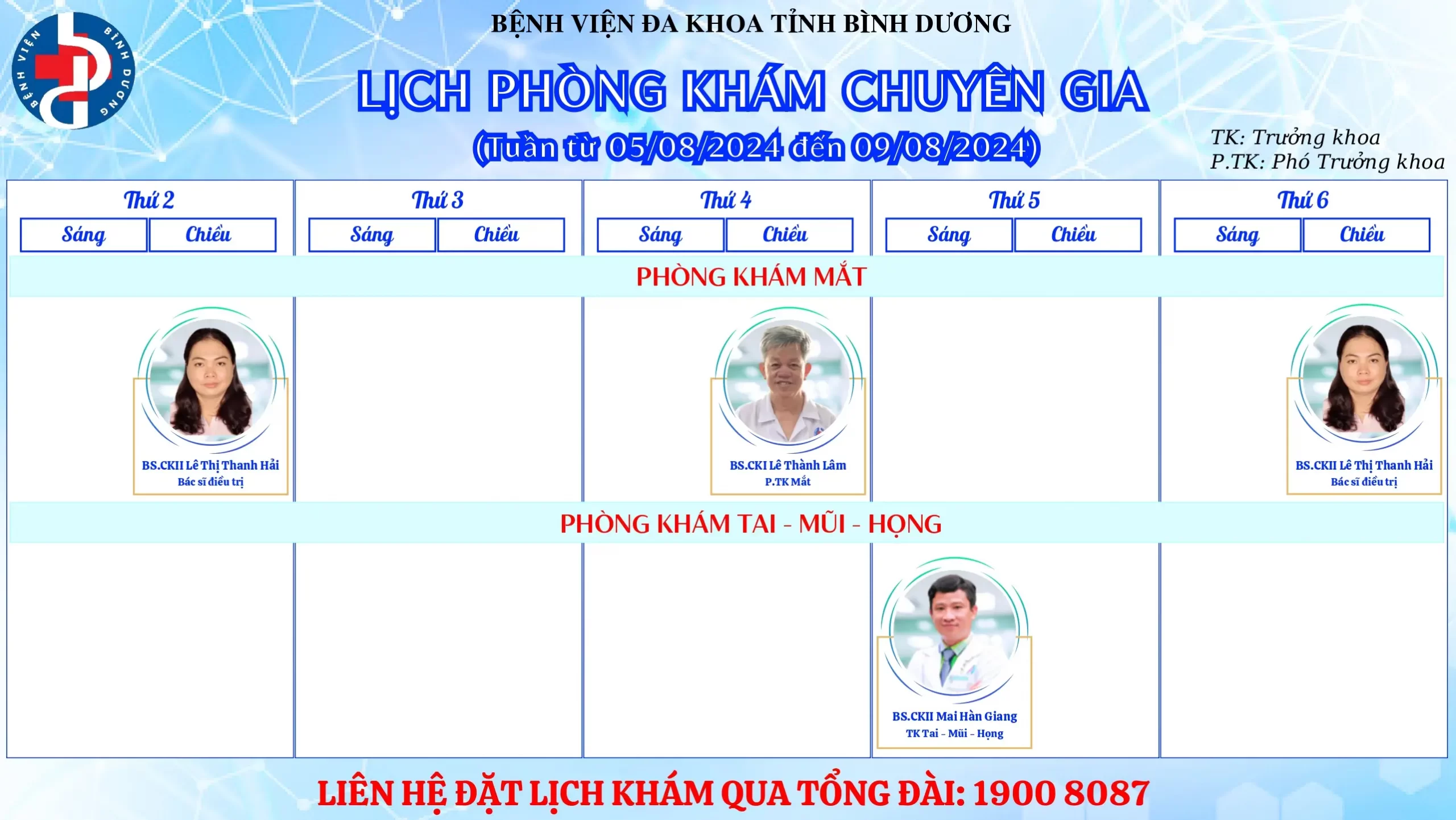 🌟🌟🌟LỊCH PHÒNG KHÁM CHUYÊN GIA BỆNH VIỆN ĐA KHOA TỈNH BÌNH DƯƠNG.