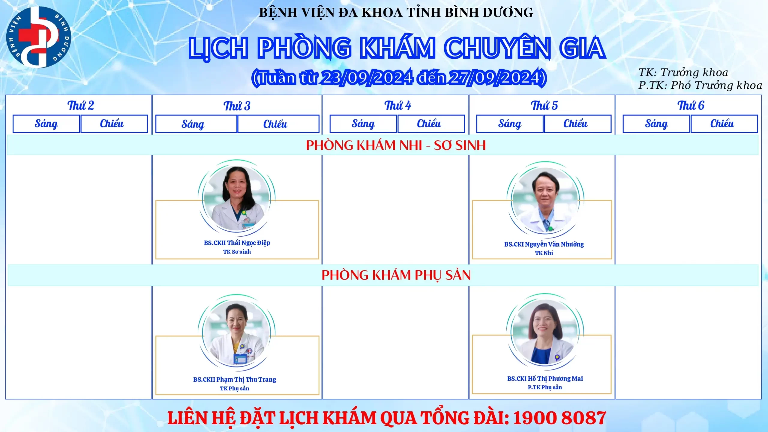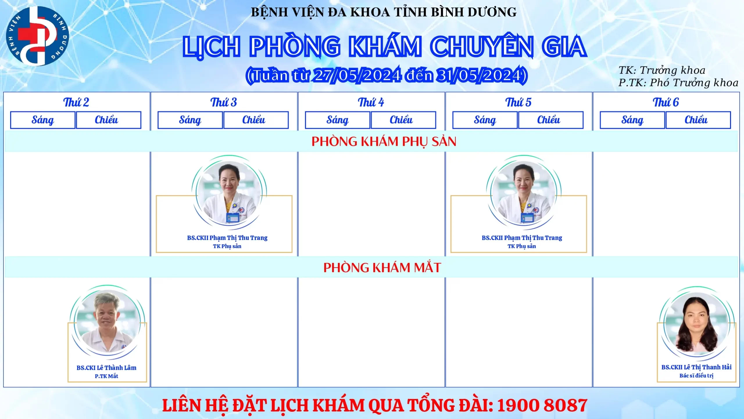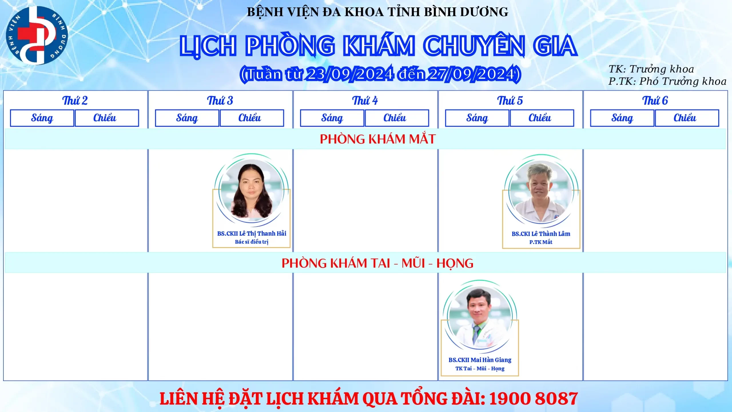 🌟🌟🌟LỊCH PHÒNG KHÁM CHUYÊN GIA BỆNH VIỆN ĐA KHOA TỈNH BÌNH DƯƠNG.