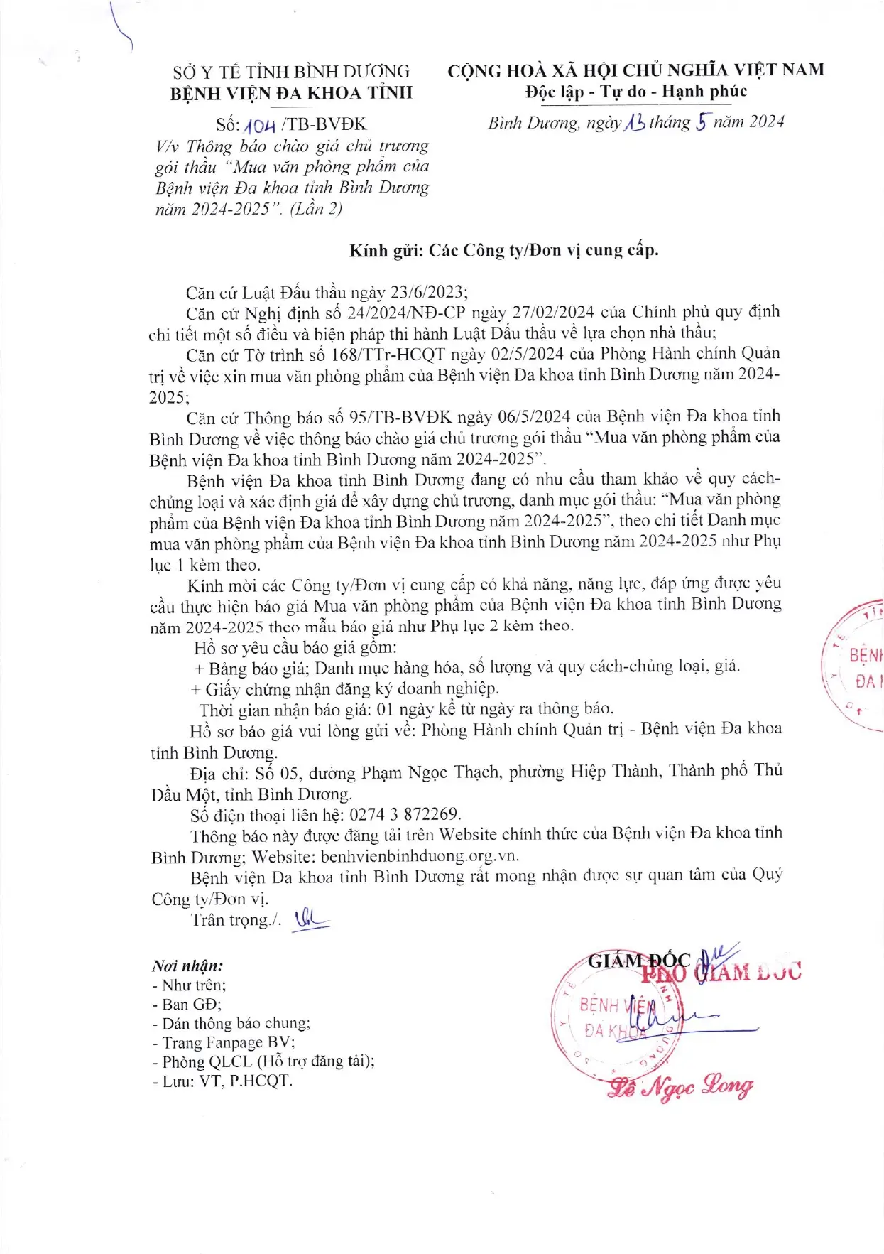📣📣📣 THÔNG BÁO MỜI CHÀO GIÁ (104/TB-BVĐK)