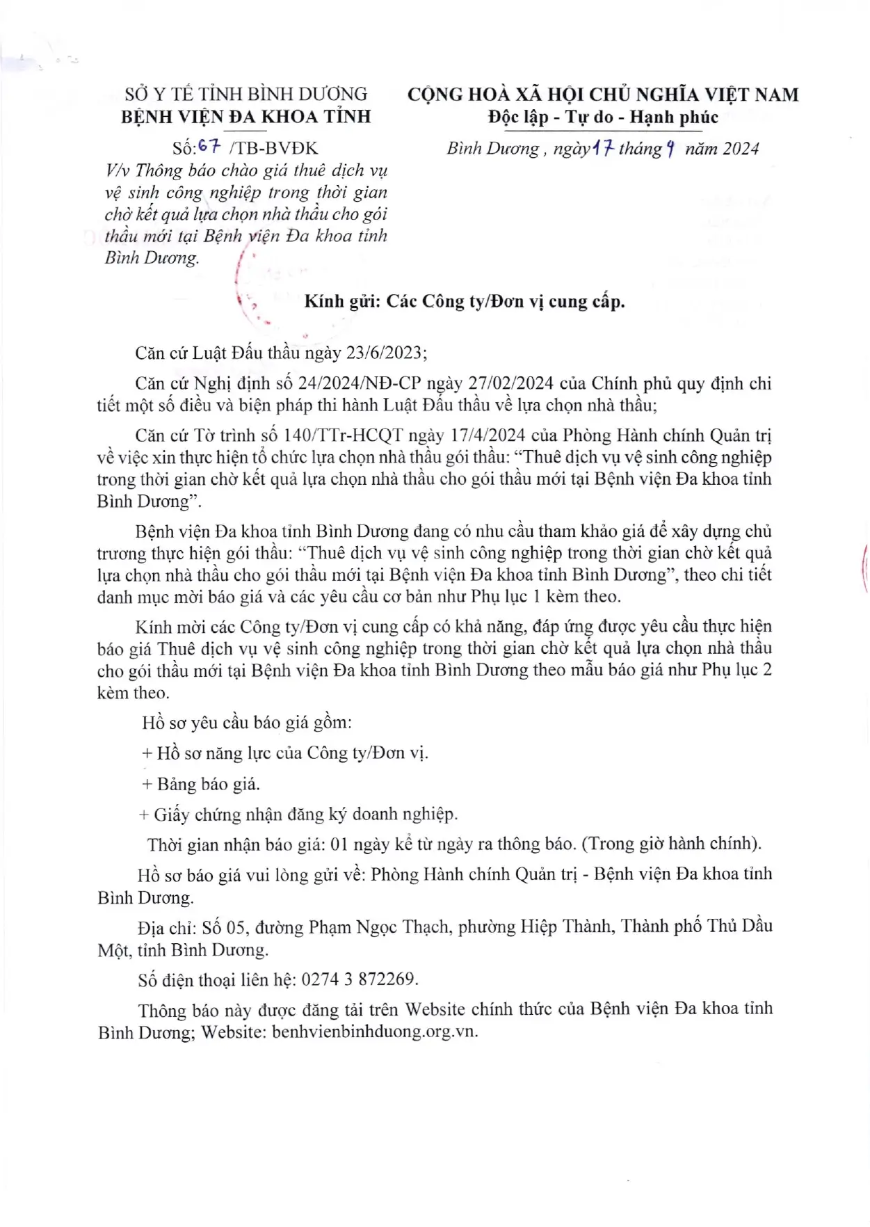📣📣📣 THÔNG BÁO MỜI CHÀO GIÁ ( 67/TB-BVĐK)