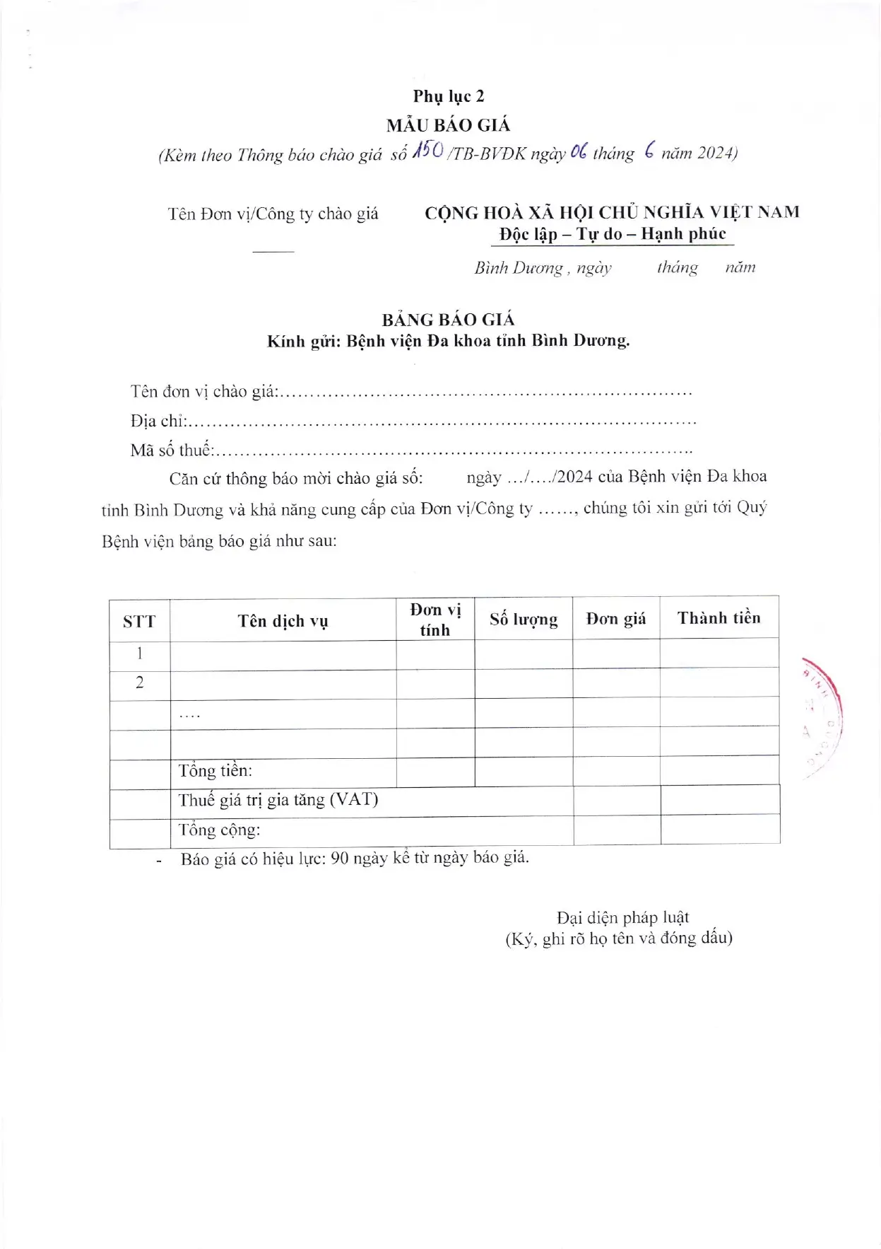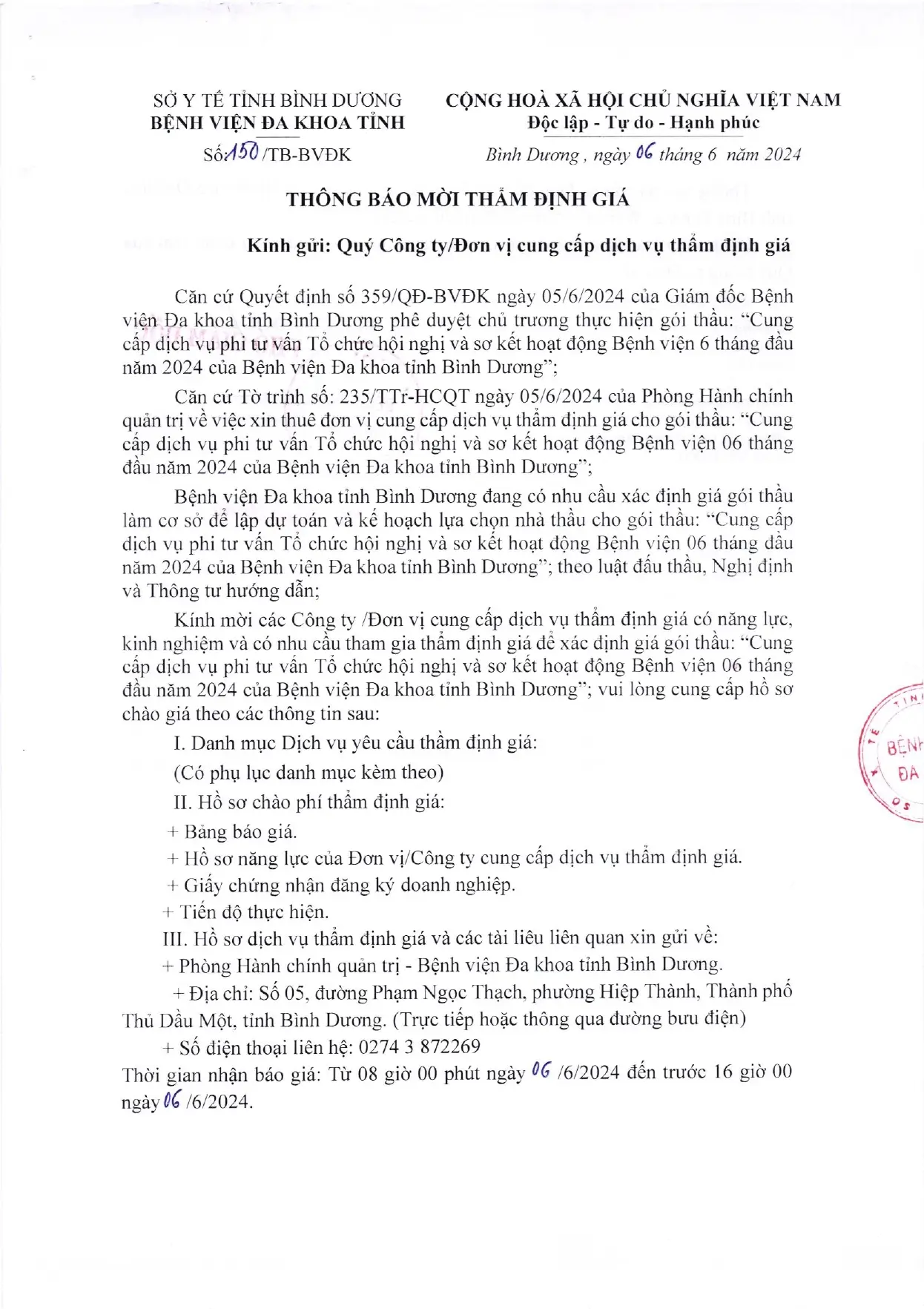📣📣📣 THÔNG BÁO MỜI THẨM ĐỊNH GIÁ (150/TB-BVĐK)