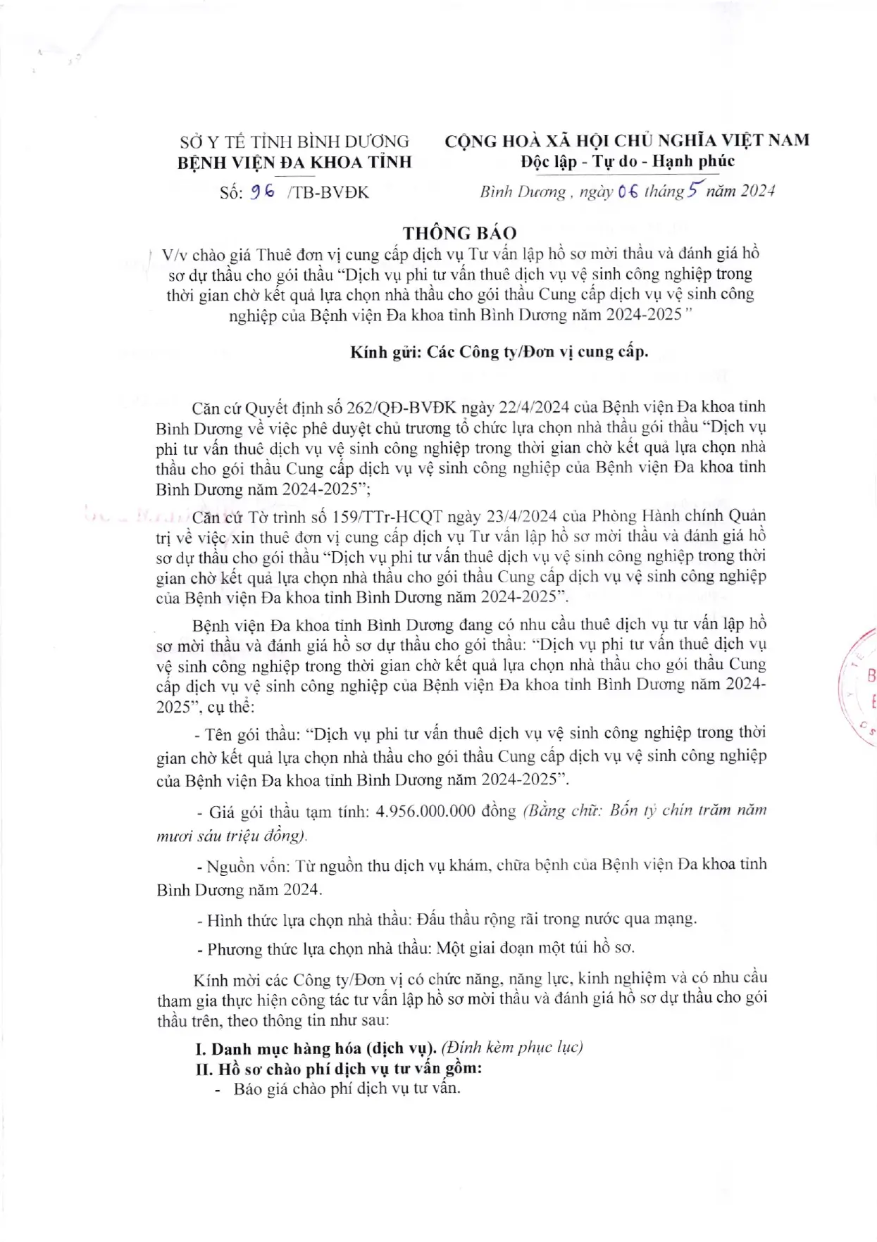 📣📣📣THÔNG BÁO CHÀO GIÁ (96/TB-BVĐK)