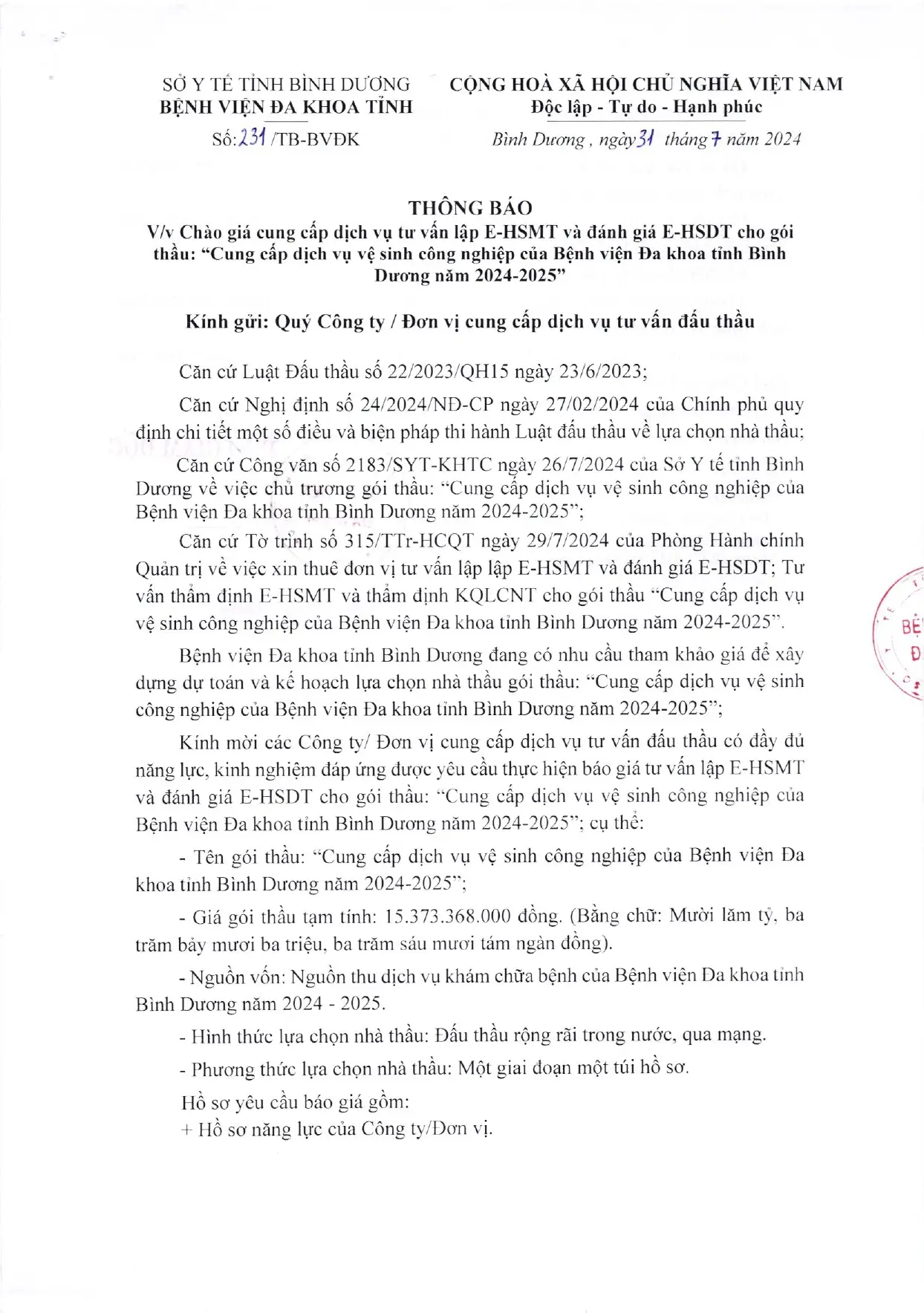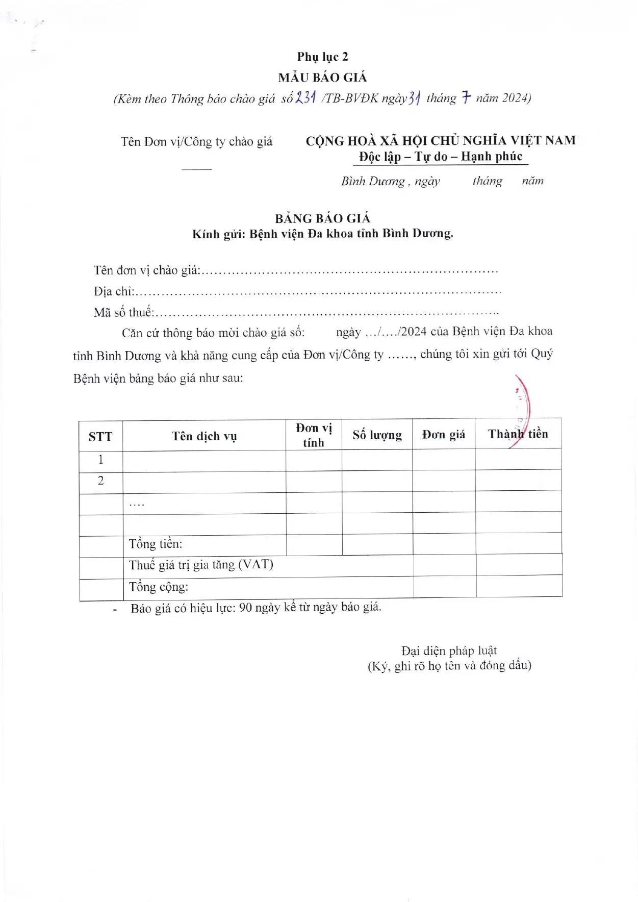 📣📣📣THÔNG BÁO MỜI CHÀO GIÁ (231/TB-BVĐK)