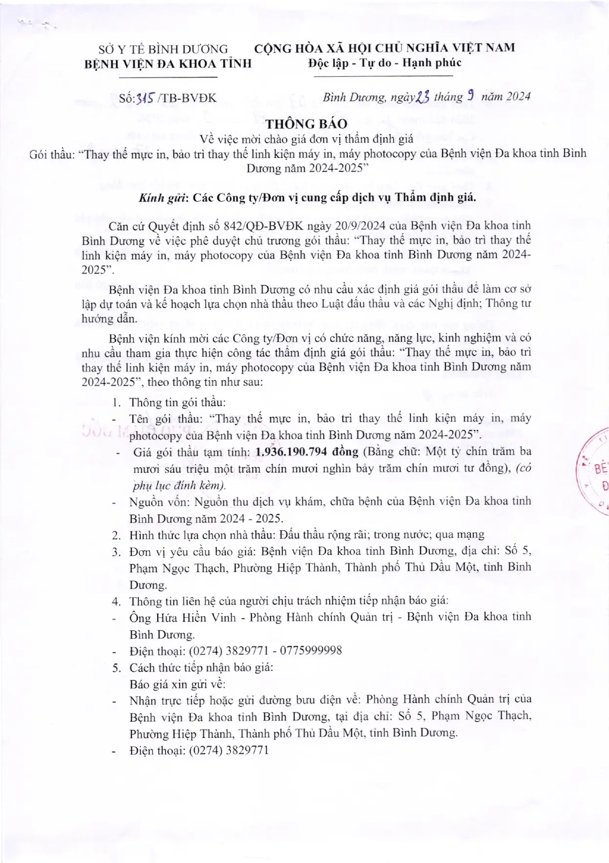 📣📣📣THÔNG BÁO MỜI THẨM ĐỊNH GIÁ (315/TB-BVĐK)