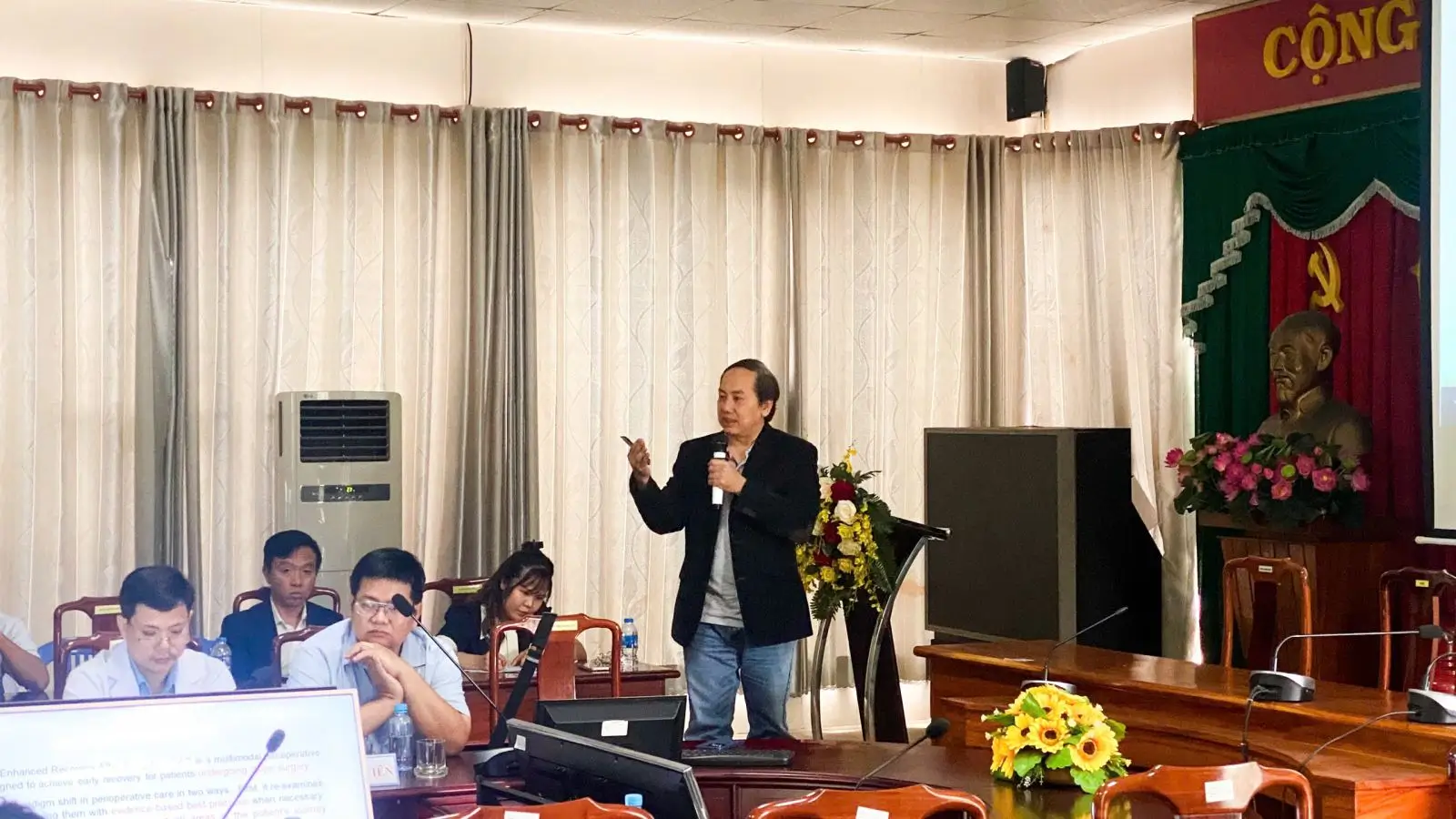 Tiếp theo, TS.BS Lê Quan Anh Tuấn – Phó Chủ tịch Chi Hội tăng cường Hồi phục sau mổ, Giảng viên Bộ môn Ngoại – Đại học Y Dược TP.HCM, Trưởng khoa Ngoại Gan Mật Tụy Bệnh viện Đại học Y Dược TP.HCM, với bài báo cáo về “ Dinh dưỡng chu phẫu trong phác đồ ERAS trong phẫu thuật ”. Trong phần trình bày của mình, TS.BS Lê Quan Anh Tuấn đã chia sẻ các nghiên cứu và thực tiễn về việc áp dụng chế độ dinh dưỡng hợp lý trong giai đoạn trước và sau phẫu thuật, đặc biệt là trong các phác đồ hồi phục sớm (ERAS), nhằm tăng cường khả năng phục hồi và giảm thiểu biến chứng sau mổ.