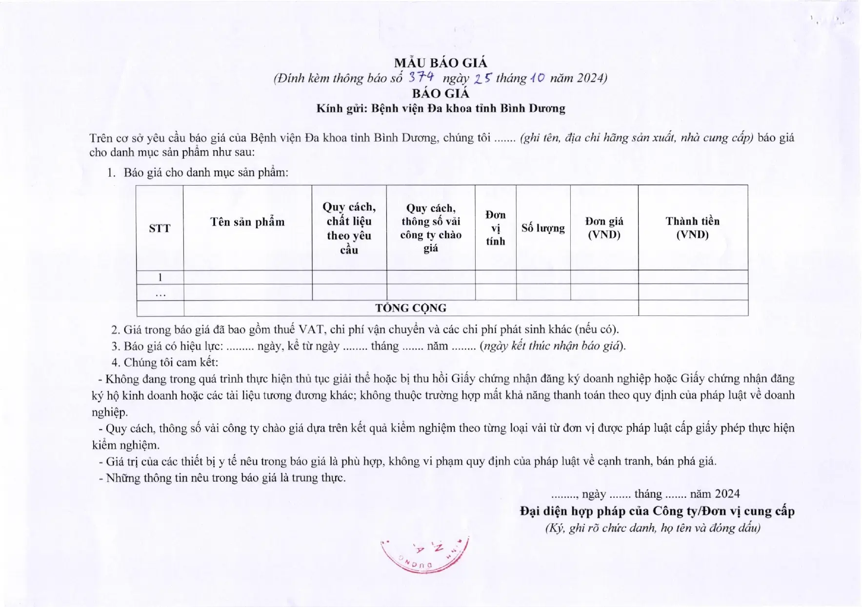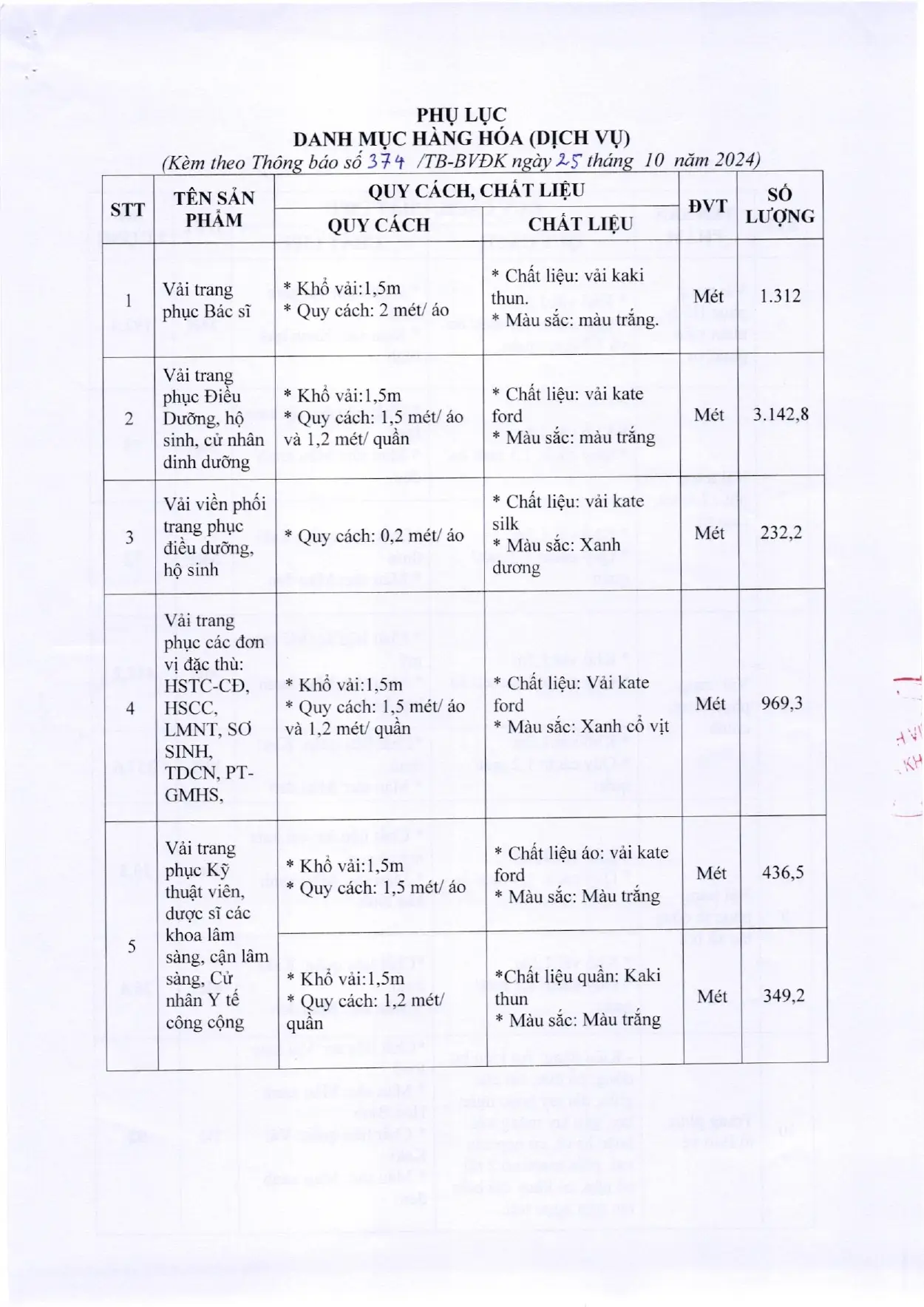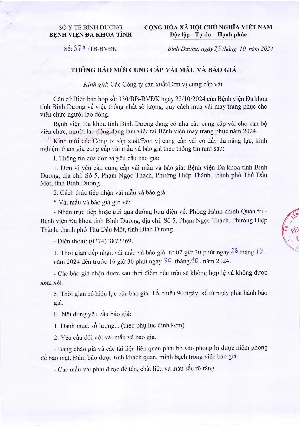 📣📣📣 THÔNG BÁO MỜI CUNG CẤP VẢI MẪU VÀ BÁO GIÁ (374/TB-BVĐK)