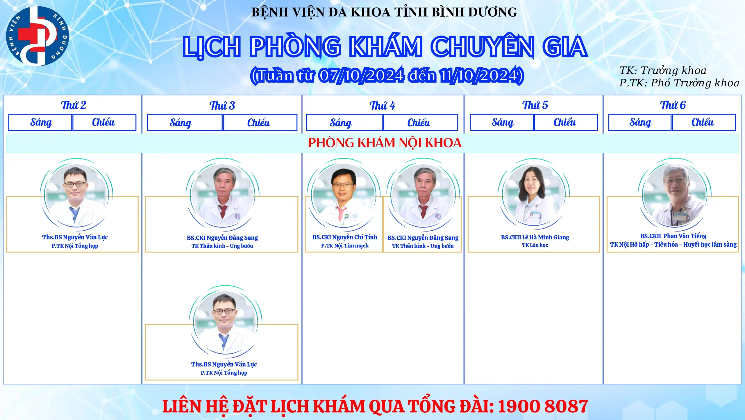 ♦️Lầu 1 – Khu khám dịch vụ – Khoa Khám bệnh ♦️Tuần từ 07/10/2024 đến 11/10/2024 ♦️Liên hệ đặt lịch khám qua Tổng đài: 1900 8087 (Trong giờ hành chính). ———————————————————————— 🏥 Bệnh viện Đa khoa tỉnh Bình Dương 🚑 Địa chỉ: Số 05, Phạm Ngọc Thạch, phường Hiệp Thành, thành phố Thủ Dầu Một, […]