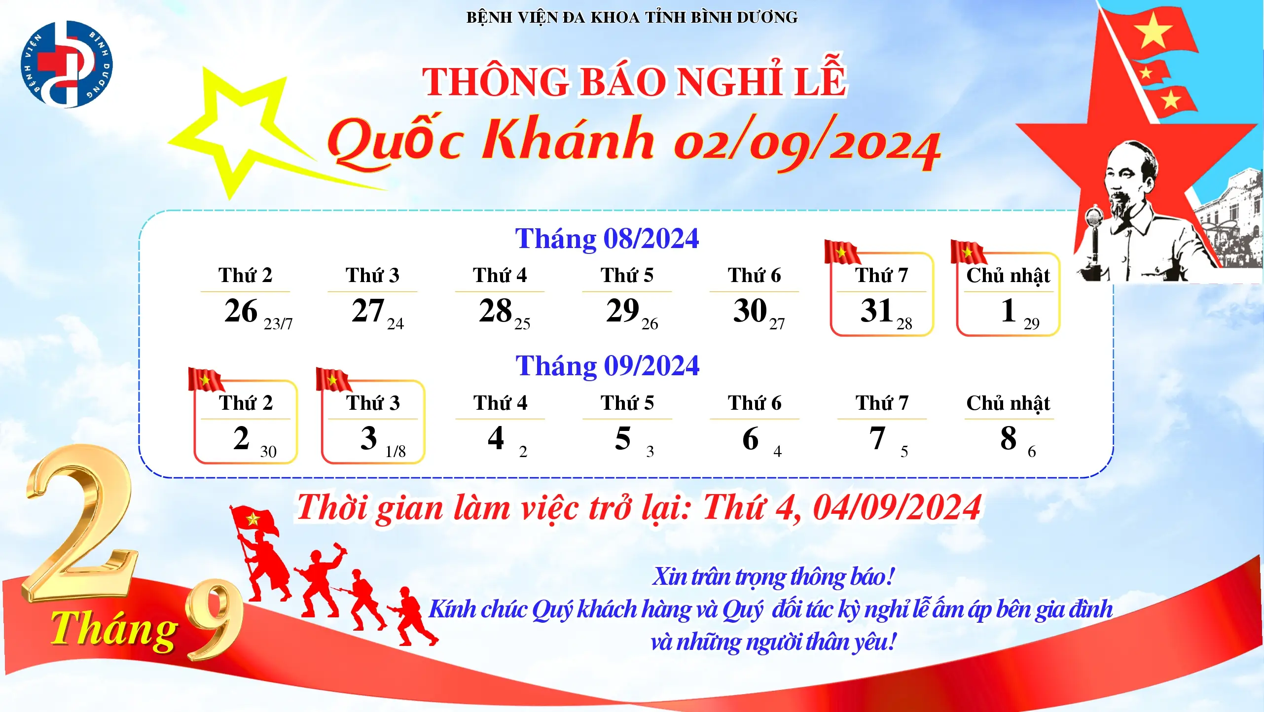 🔶 Bệnh viện Đa khoa tỉnh Bình Dương trân trọng thông báo lịch nghỉ lễ Quốc Khánh 02/09/2024 đến Quý khách hàng và Quý đối tác như sau: ⏰ Thời gian nghỉ lễ: Từ Thứ 7, ngày 31/08/2024 đến hết Thứ 3, ngày 03/09/2024. ⏰ Thời gian làm việc trở lại: Bệnh viện sẽ quay […]
