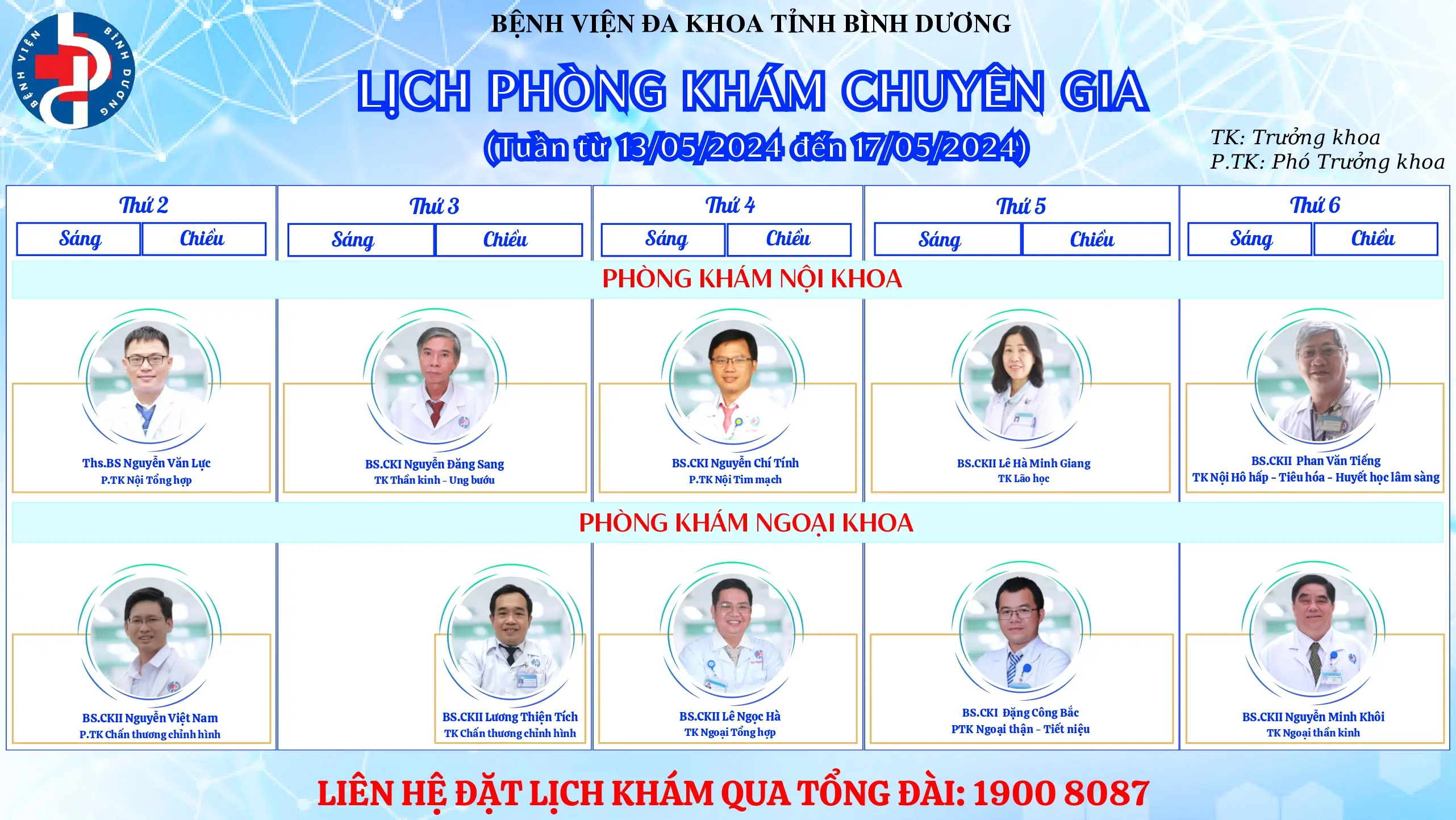 ♦️Lầu 1 – Khu khám dịch vụ – Khoa Khám bệnh ♦️Tuần từ 13/05/2024 đến 17/05/2024 ♦️Liên hệ đặt lịch khám qua Tổng đài: 1900 8087 (Trong giờ hành chính). ———————————————————————— 🏥 Bệnh viện Đa khoa tỉnh Bình Dương 🚑 Địa chỉ: Số 05, Phạm Ngọc Thạch, phường Hiệp Thành, thành phố Thủ Dầu Một, […]