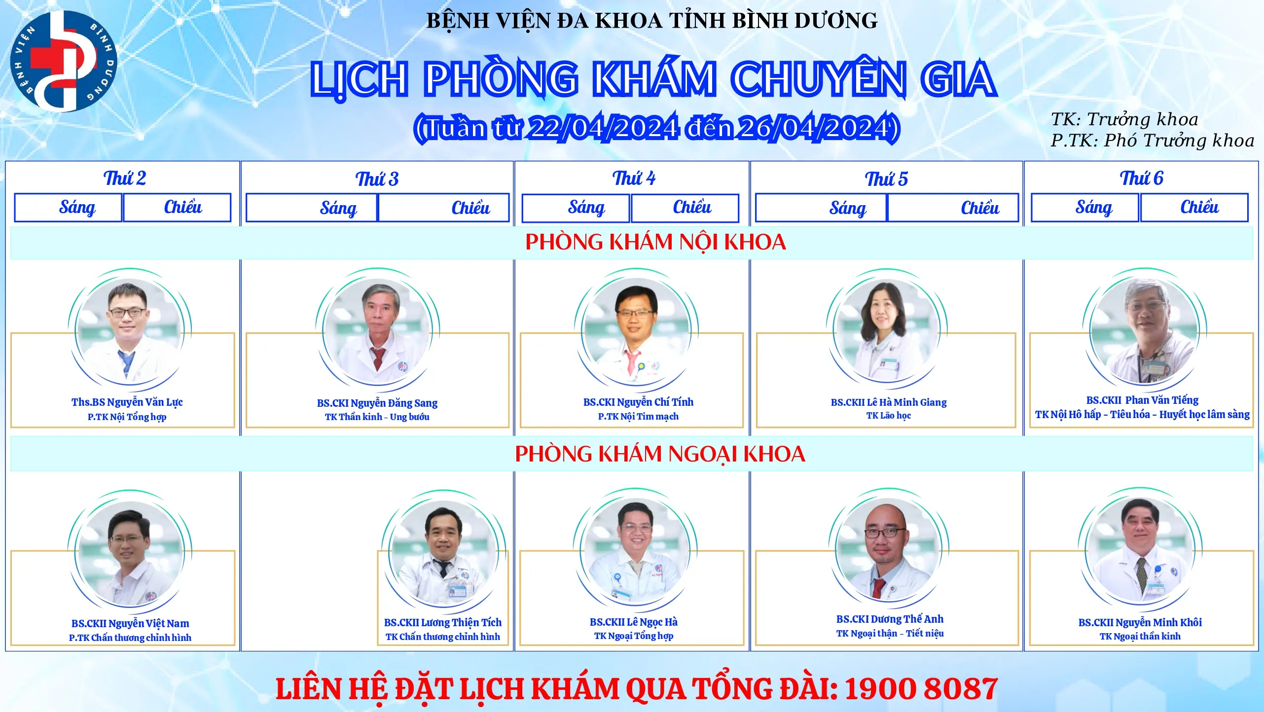 ♦️Lầu 1 – Khu khám dịch vụ – Khoa Khám bệnh ♦️Tuần từ 22/04/2024 đến 26/04/2024 ♦️Liên hệ đặt lịch khám qua Tổng đài: 1900 8087 (Trong giờ hành chính). ———————————————————————— 🏥 Bệnh viện Đa khoa tỉnh Bình Dương 🚑 Địa chỉ: Số 05, Phạm Ngọc Thạch, phường Hiệp Thành, thành phố Thủ Dầu Một, […]