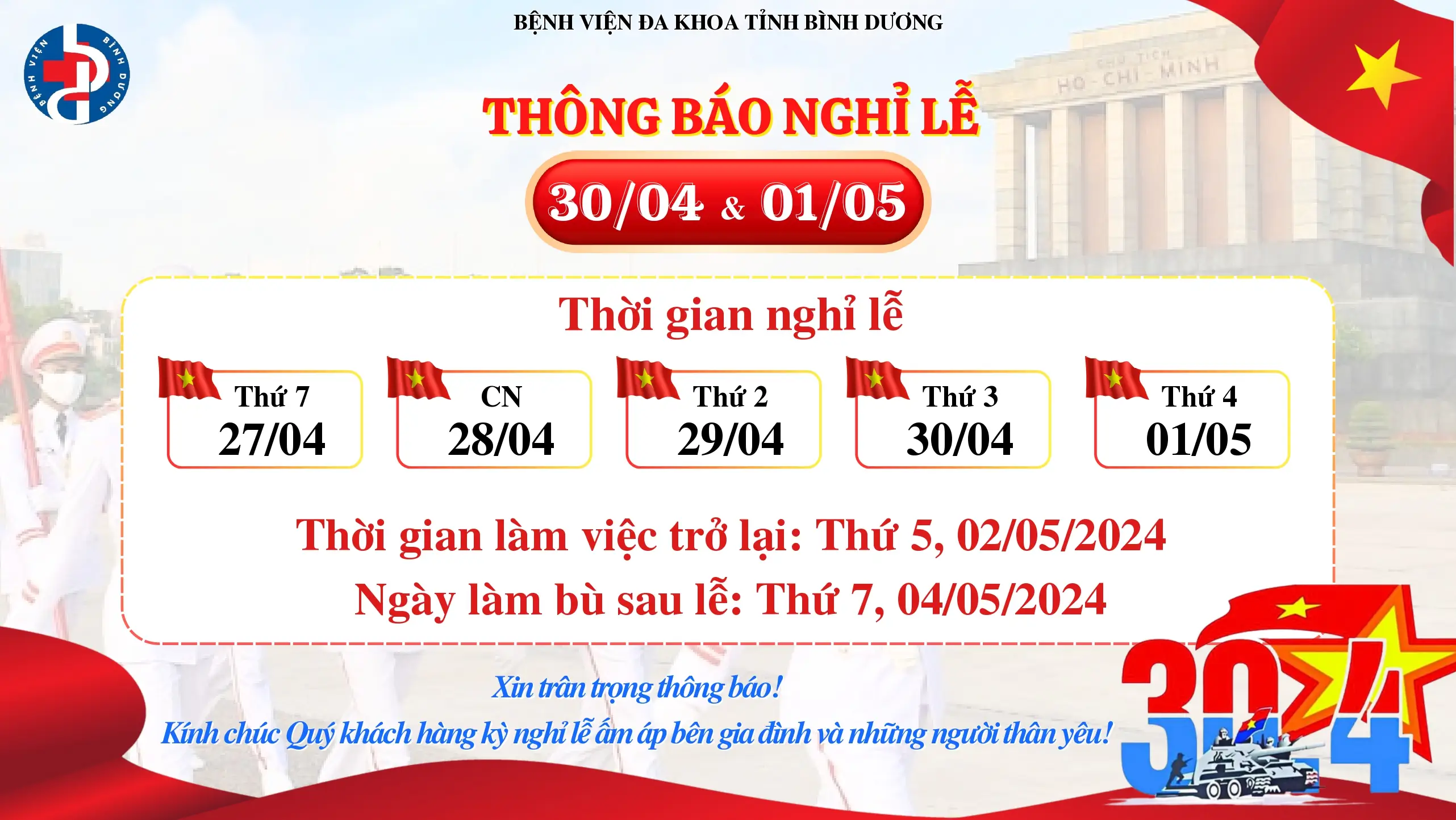 🔶 Bệnh viện Đa khoa tỉnh Bình Dương trân trọng thông báo lịch nghỉ 30/04 & 01/05/2024 đến Quý khách hàng và Quý đối tác như sau: ⏰ Thời gian nghỉ lễ: Từ Thứ 7 ngày 27/04/2024 đến hết Thứ 4 ngày 01/05/2024. ⏰ Thời gian làm việc trở lại: Bệnh viện sẽ quay trở […]