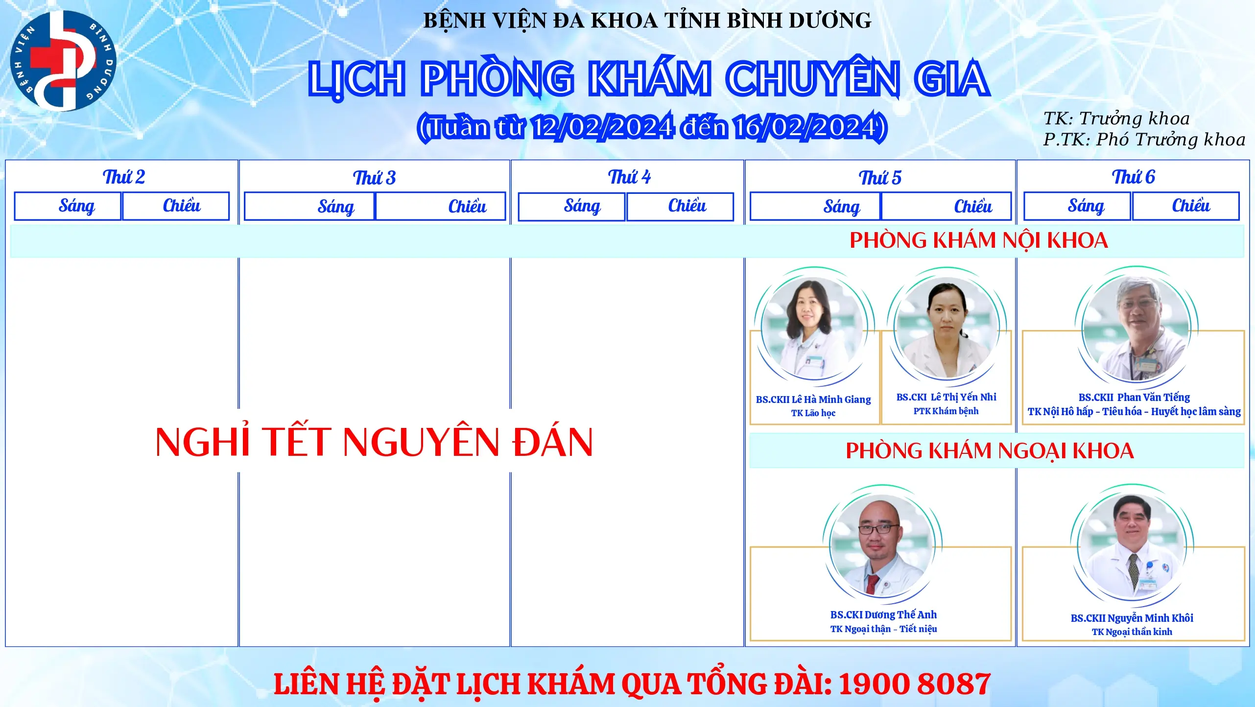 ♦️Lầu 1 – Khu khám dịch vụ – Khoa Khám bệnh ♦️Tuần từ 19/02/2024 đến 23/02/2024 ♦️Liên hệ đặt lịch khám qua Tổng đài: 1900 8087 (Trong giờ hành chính). ———————————————————————— 🏥 Bệnh viện Đa khoa tỉnh Bình Dương 🚑 Địa chỉ: Số 05, Phạm Ngọc Thạch, phường Hiệp Thành, thành phố Thủ Dầu Một, […]