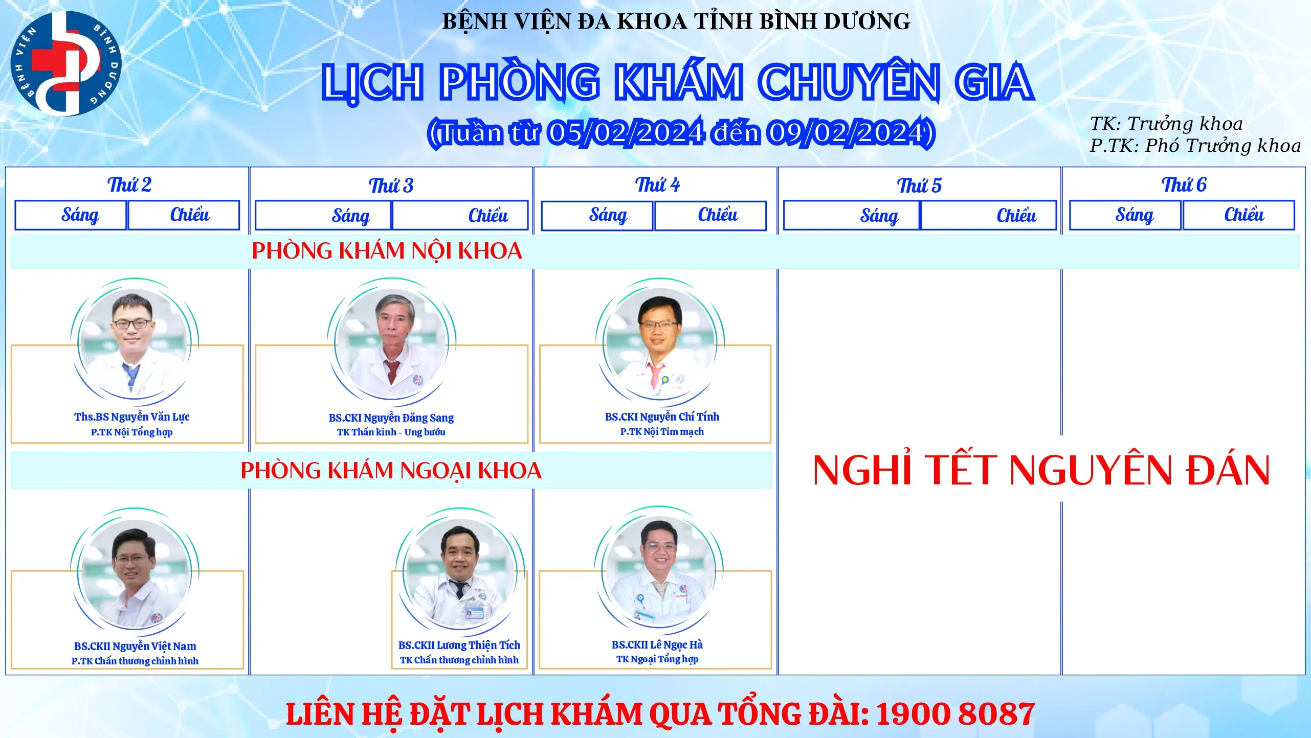 ♦️Lầu 1 – Khu khám dịch vụ – Khoa Khám bệnh ♦️Tuần từ 05/02/2024 đến 09/02/2024 ♦️Liên hệ đặt lịch khám qua Tổng đài: 1900 8087 (Trong giờ hành chính). ———————————————————————— 🏥 Bệnh viện Đa khoa tỉnh Bình Dương 🚑 Địa chỉ: Số 05, Phạm Ngọc Thạch, phường Hiệp Thành, thành phố Thủ Dầu Một, […]