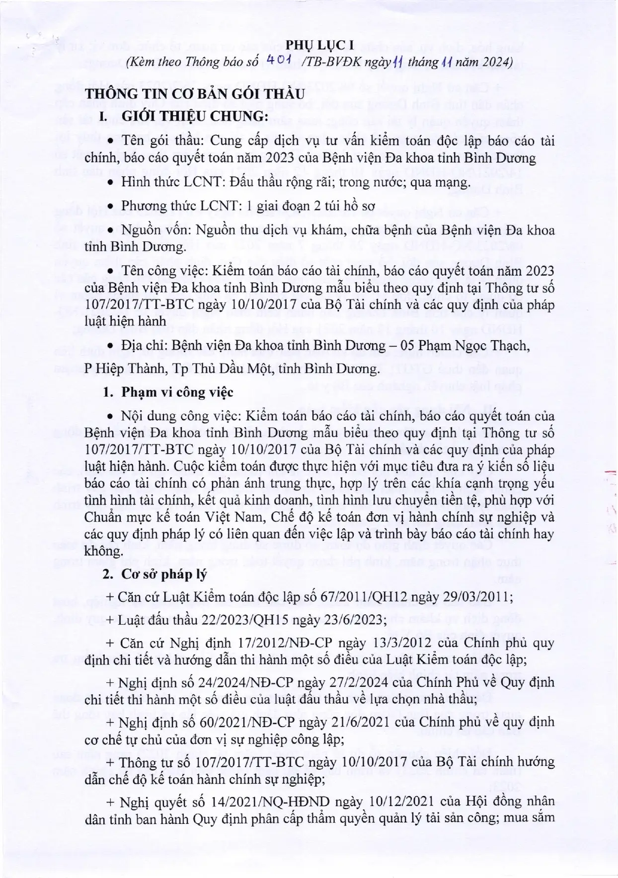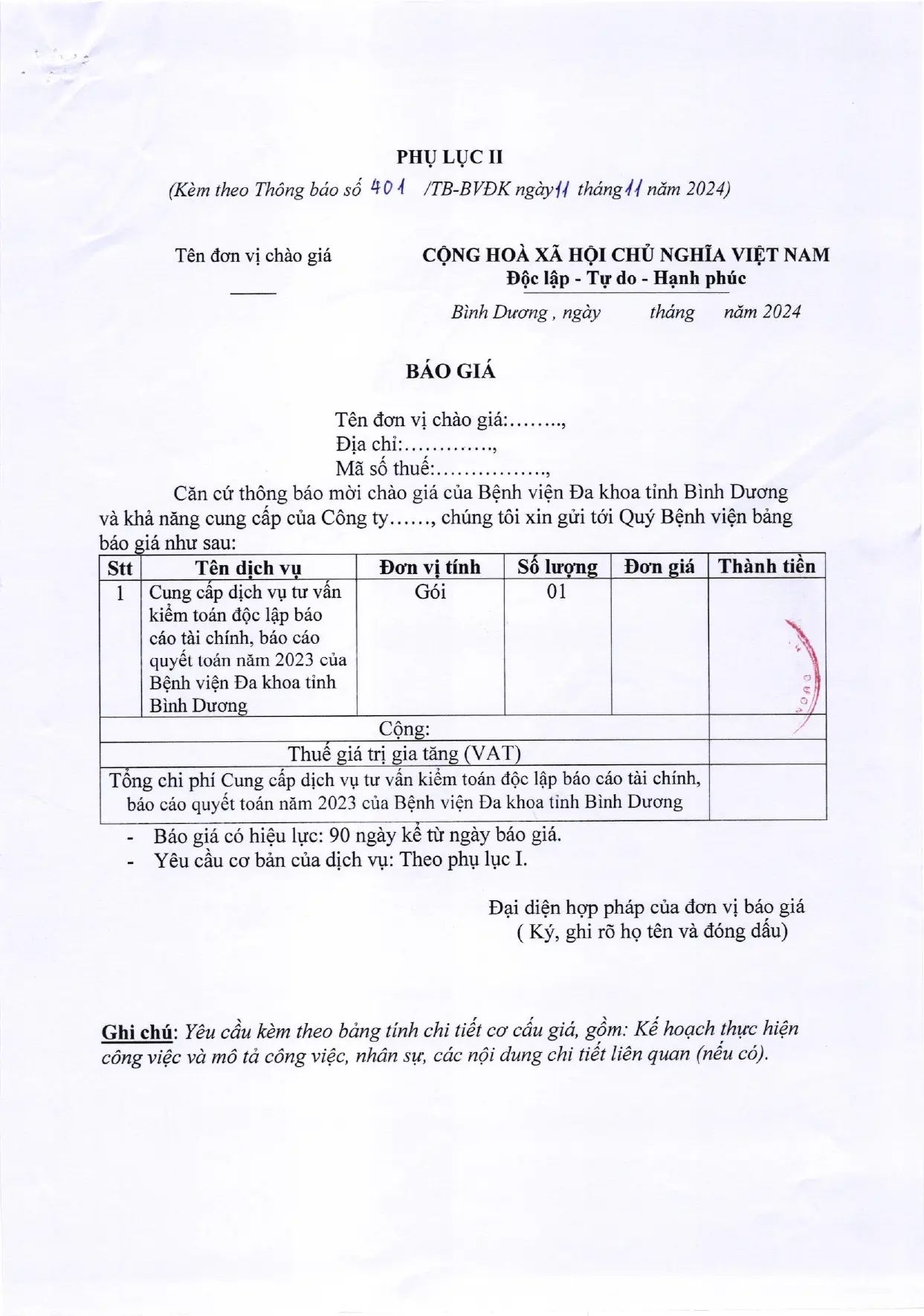 YÊU CẦU BÁO GIÁ (401/TB-BVĐK)