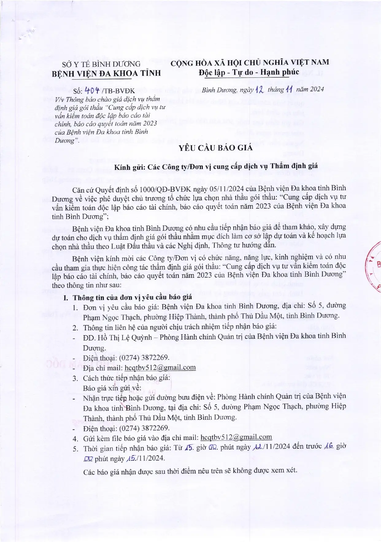 YÊU CẦU BÁO GIÁ (404/TB-BVĐK)